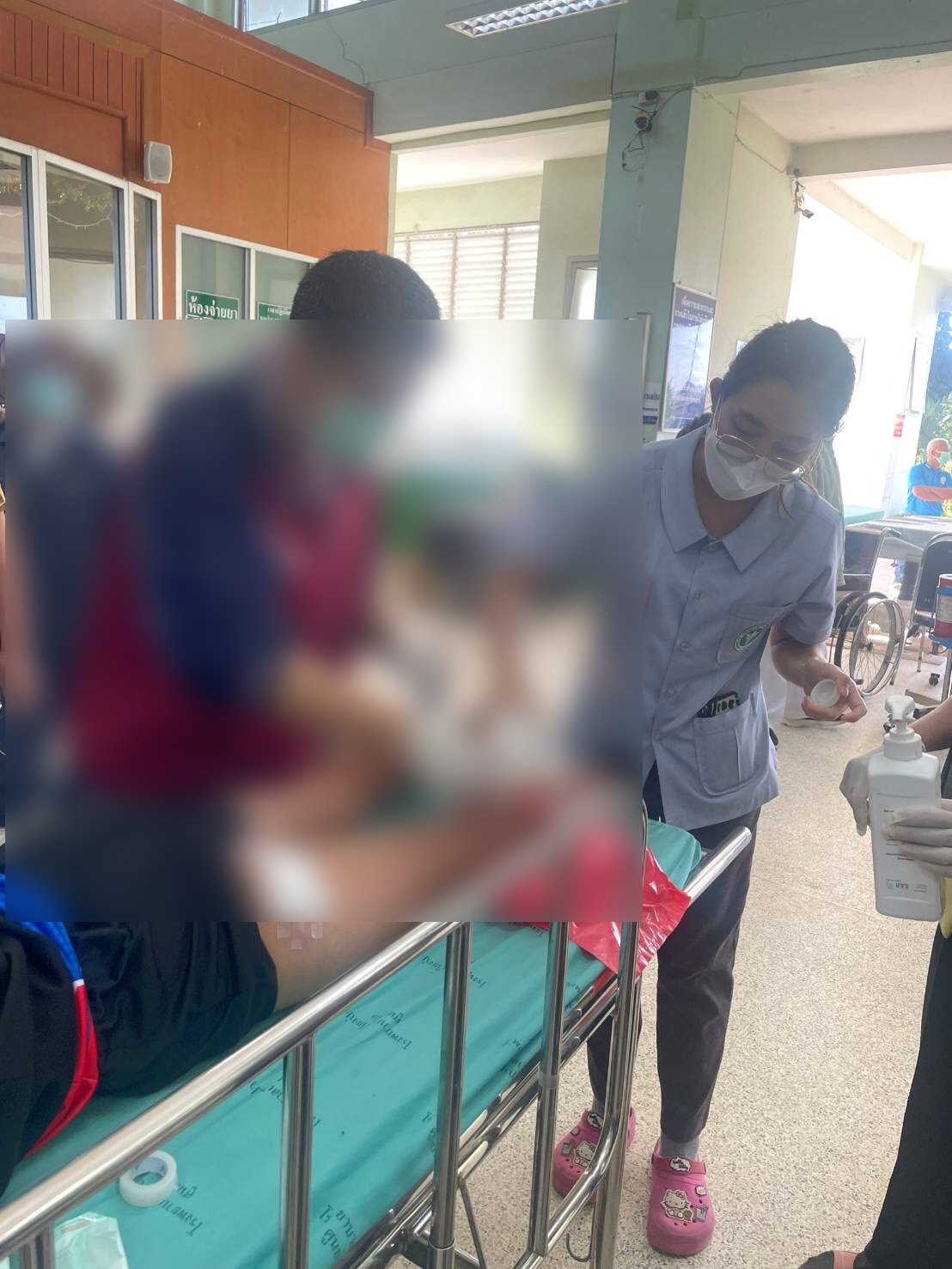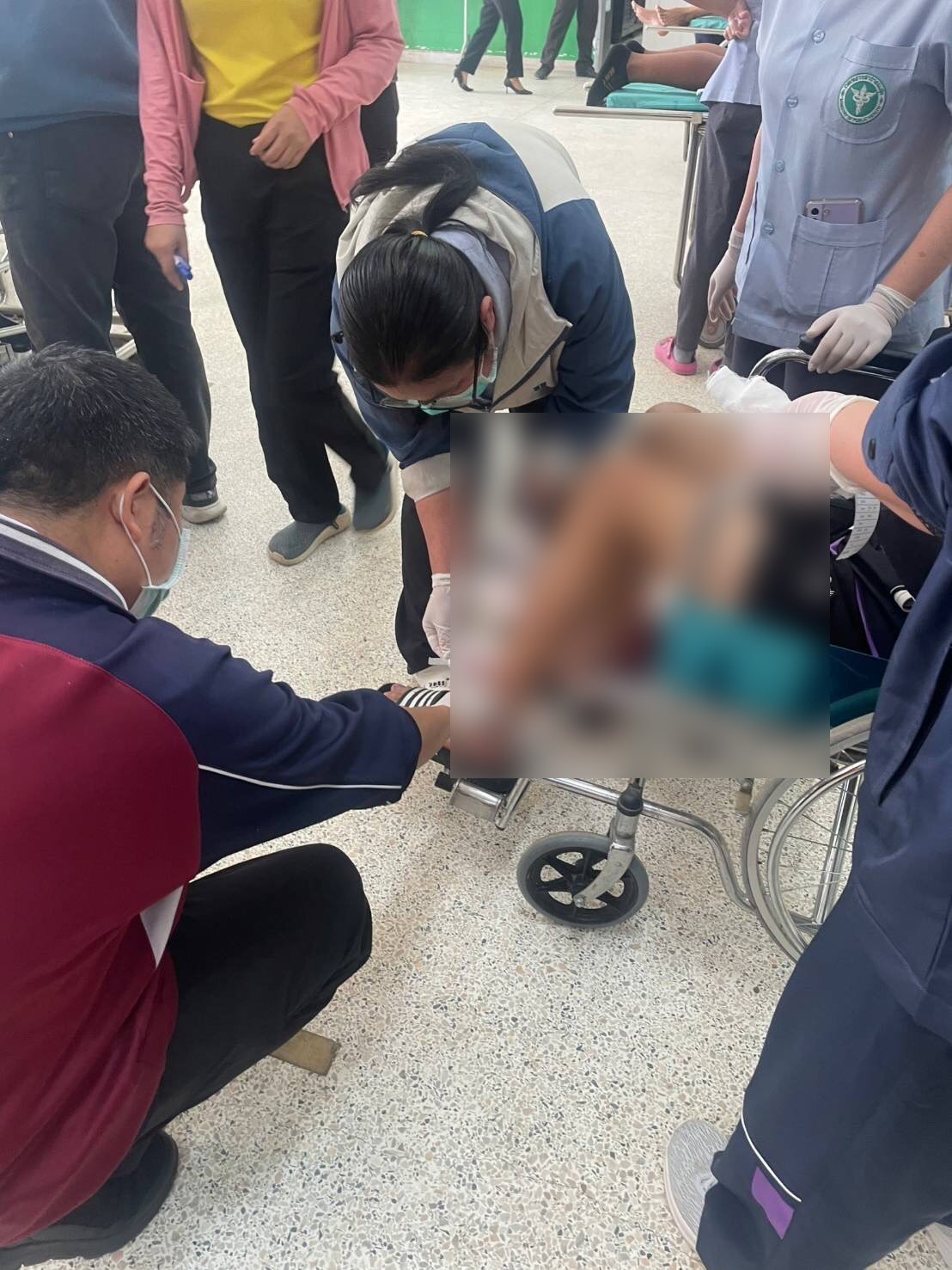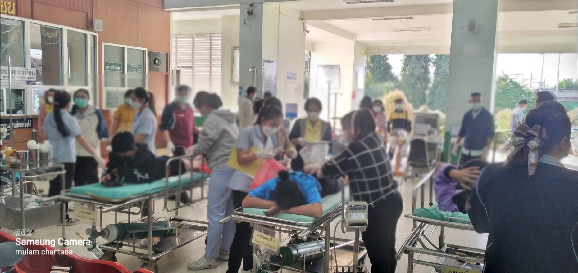 เมื่อไปถึงพบครูและนักเรียนกำลังพากันช่วยปฐมพยาบาลู้ได้รับบาดเจ็บโดย ซึ่งส่วนใหญ่เป็นนักเรียนระดับมัธยมศึกษา ต่อมาทางโรงเรียนและหน่วยกู้ภัยได้นำผู้ได้รับบาดเจ็บทั้งหมดนำส่งโรงพยาบาลเวียงป่าเป้า โดยผู้ป่วยเป็นนักเรียนชายที่ยังศึกษาอยู่ในระดับมัธยมศึกษาทั้งตอนต้นและม.ปลาย และครู เป็นชายจำนวน 4 คน และหญิงจำนวน 4 คน บาดเจ็บเพราะถูกสะเก็ดพลุที่ผิวหนังจนเป็นแผล แต่เกือบทั้งหมดอาการแบบฉุกเฉินไม่รุนแรงหรือสีเขียวและมีผู้บาดเจ็บฉุกเฉินเร่งด่วนหรืออยู่ในเกณฑ์สีเหลืองจำนวน 1 คน และได้รับการรักษาจนปลอดภัยทุกคน
