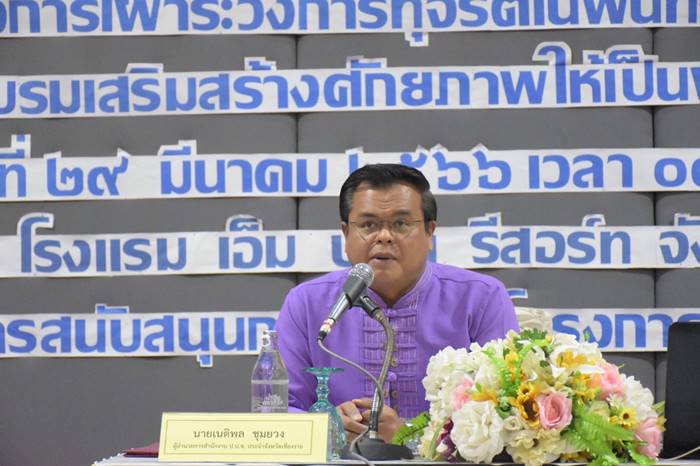 วันที่ 29 มีนาคม 2566 นายเนติพล ชุมยวง ผู้อำนวยการสำนักงาน ป.ป.ช. ประจำจังหวัดเชียงราย ได้รับเกียรติเป็นประธานในพิธีเปิดโครงการเฝ้าระวังการทุจริตในพื้นที่จังหวัดเชียงราย กิจกรรมการอบรมเสริมสร้างศักยภาพให้เป็นผู้สังเกตการณ์ที่มีคุณภาพพร้อมทั้งได้มอบหมายให้เจ้าหน้าที่กลุ่มงานป้องกันการทุจริต เข้าร่วมเข้าร่วมกิจกรรม ซึ่งจัดโดยชมรม STRONG – จิตพอเพียงต้านทุจริต จังหวัดเชียงราย ณ โรงแรมเอ็ม บูทีค รีสอร์ท เชียงราย อ.เมืองเชียงราย จ.เชียงราย