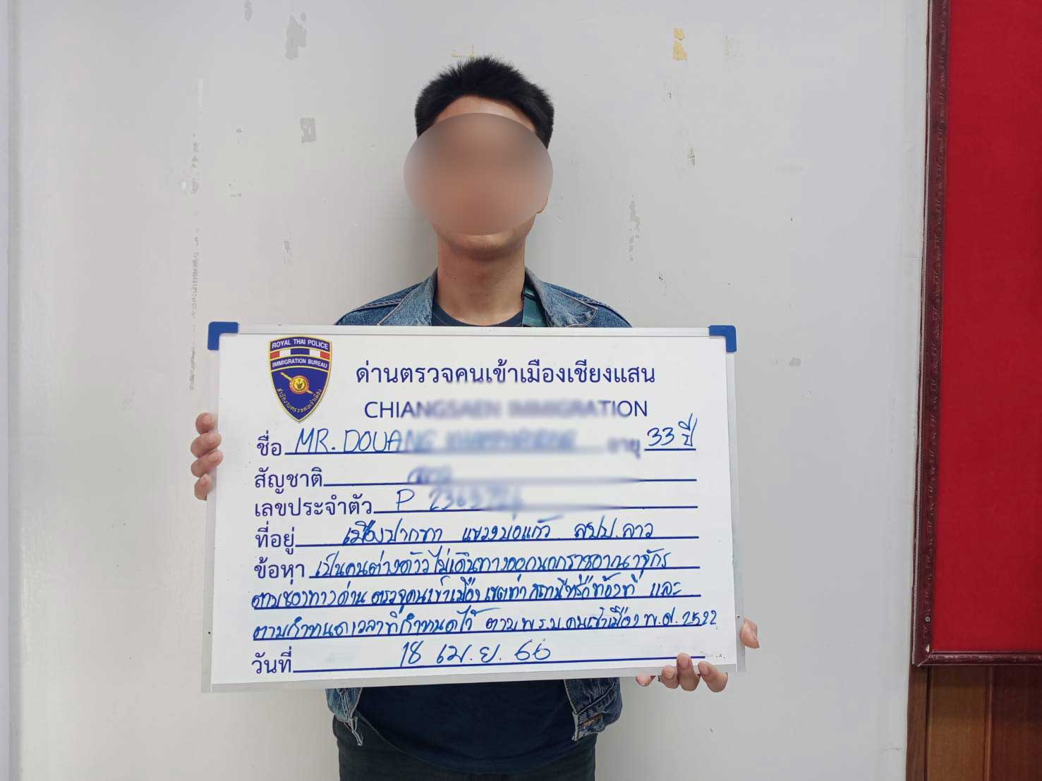วันที่ 18 เมษายน 2566 ชุดสืบสวนปราบปราม ด่าน ตม.เชียงแสน จังหวัดเชียงราย ภายใต้การอำนวยการของ ว่าที่ พ.ต.อ.ชินกร อัศวภูมิ ผกก.ด่าน ตม.เชียงแสน นำโดย พ.ต.ท.หญิง กัญญาวรัตน์ จุลศาสตร์ รอง ผกก.ด่าน ตม.เชียงแสน พ.ต.ท.ณัฐวัตร มิตรคุณ สารวัตรด่าน ตม.เชียงแสน ได้ร่วมกันจับกุม นายดวง (สงวนนามสกุล) อายุ 33 ปี สัญชาติลาว ที่อยู่ เมืองปากทา แขวงบ่อแก้ว สปป.ลาว