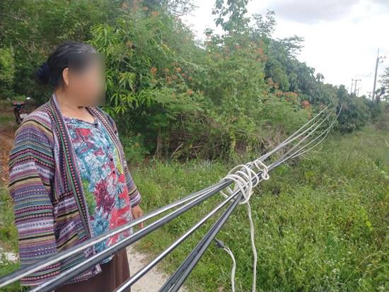 นางปราศรัย ศรีกุลวงศ์ 68 ปี ม.7 เล่าว่า หลังจากช่างไฟฟ้าได้เข้ามาย้ายเสาไฟฟ้าเพื่อเตรียมขยายถนน เขาก็ทิ้งสายสื่อสารเอาไว้ไม่มีการมาแก้ไข เคยมีคนอื่นในหมู่บ้านไปแจ้งการไฟฟ้าเขาก็บอกว่าเขาดำเนินการในส่วนของเขาเสร็จแล้ว ในส่วนของสายสื่อสารต้องให้ผู้ให้บริการโทรศัพท์และอินเตอร์เน็ตมาจัดการเอง แต่รอมานาน 2 เดือน ก็ยังไม่มีการเข้ามาแก้ไข ทิ้งสายกองกับพื้นหรือห้อยหย่อนขวางทางเข้าออกบ้าน ทุกวันนี้ต้องแก้ปัญหาโดยการนำไม้มาค้ำยันสายดังกล่าวไว้ ตนก็หวั่นว่าหากไม่มาแก้ปัญหา สักวันก็อาจจะเกิดอุบัติเหตุขึ้นได้ อยากให้รีบเข้ามาแก้ปัญหาให้ชาวบ้านด้วย