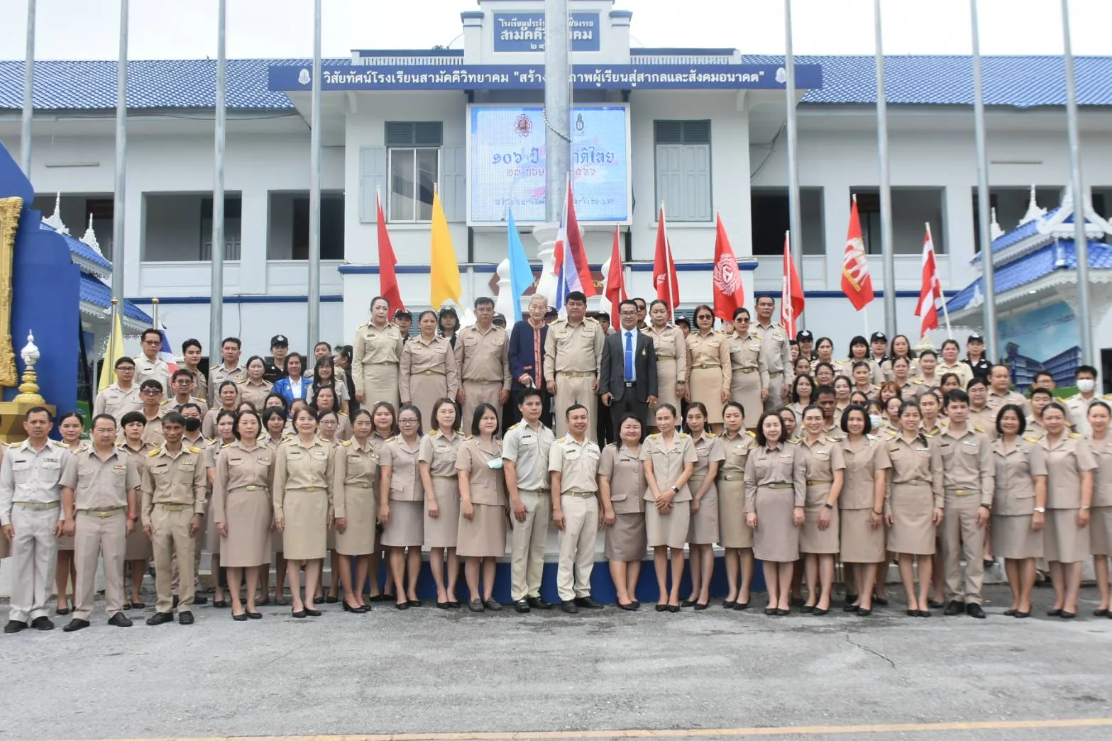 วันที่ 28 กันยายน 2566 โรงเรียนพลเมือง ศูนย์พัฒนาการเมืองภาคพลเมือง สถาบันพระปกเกล้า จังหวัดเชียงราย ร่วมกับสมาคมสื่อมวลชนและนักประชาสัมพันธ์เชียงราย และโรงเรียนสามัคคีวิทยาคม จัดกิจกรรม 106 ปี ธงชาติไทย โดยมีนายจรัล แก้วเป็ง ผู้อำนวยการโรงเรียนสามัคคีวิทยาคม เป็นประธาน การจัดกิจกรรมดังกล่าว และมี ผศ.ดร.เด่นศักดิ์ สุริยะ อุปนายกสมาคมสื่อมวลชนและนักประชาสัมพันธ์เชียงราย/ประธานศูนย์พัฒนาการเมืองภาคพลเมือง สถาบันพระปกเกล้า จังหวัดเชียงราย, สำนักงานศึกษาธิการจังหวัดเชียงราย นำโดยนายคมสันต์ บุญตั้ง ผู้อำนวยการกลุ่มบริหารงานบุคคล, ชมรมนักจัดรายการวิทยุเชียงราย โดย ร.ต.รุ่งโรจน์ เหลืองอร่าม, นายแพทย์อำพน ศิริบุญมา ที่ปรึกษาสโมสรฝึกการพูดเชียงราย และ ข้าราชการครูและพนักงานราชการ นักเรียนโรงเรียนสามัคคีวิทยาคม เข้าร่วมกิจกรรม