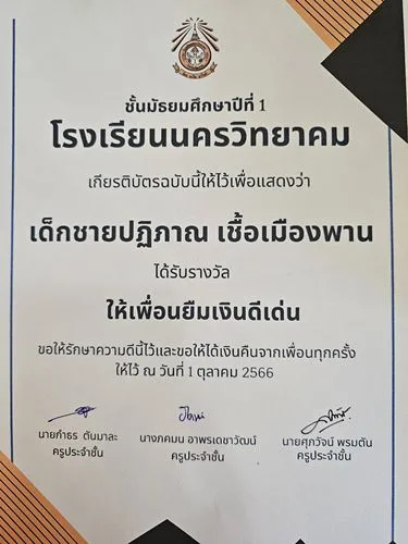 ผู้สื่อข่าวได้เดินทางไปที่โรงเรียนนครวิทยาคม บ้านสันนคร ม.20 ต.สันมะเค็ด อ.พาน จ.เชียงราย พบกับนายศุภวัจน์ พรมตัน ครูประจำชั้น ม.1 และสอนภาษาไทย เผยกับผู้สื่อข่าวว่า ตนเป็นครูประจำชั้น ม.1 ซึ่งมีเด็กนักเรียนอยู่ทั้งหมด จำนวน 25 คน สำหรับการมอบใบเกียรติบัตร ให้กับเด็กนักเรียนในชั้นตามที่ปรากฏเป็นข่าวไปนั้น แรกเริ่มตนได้แชทคุยในกลุ่มไลน์ของชั้น ม.1 ว่าให้เด็กแต่ละคนบอกถึงความภาคภูมิใจ หรือความดีของตนเอง ที่ได้ทำในภาคเรียนที่ 1 ที่ผ่านมา เพื่อให้เด็กนักเรียนได้รู้จักตนเอง รู้สึกภาคภูมิใจในตนเอง ก็จะมีเด็กนักเรียนตอบกลับมาหลากหลาย เช่น ทักทายครูดีเด่น ช่วยเพื่อนทำเวร และที่เรียกเสียงหัวเราะในหมู่เพื่อนก็คือ ให้เพื่อนยืมเงินดีเด่น ซึ่งถ้าเป็นในมุมของเด็ก ๆ ก็ถือเป็นการช่วยเหลือเพื่อน ๆ แต่ในมุมผู้ใหญ่ก็ถือเป็นเรื่องใหญ่มาก แต่ก็เป็นสิ่งที่เด็กภาคภูมิใจ และตนก็ได้เขียนไปในใบเกียรติบัตรว่าขอให้ได้เงินคืนจากเพื่อนทุกครั้ง