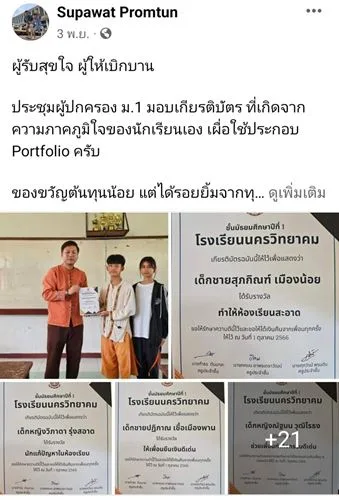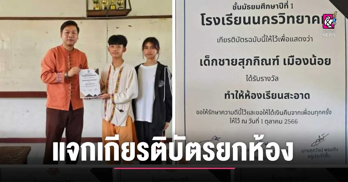วันที่ 15 พ.ย. 66 ผู้สื่อข่าวติดตามกรณีที่มีครูมอบเกียรติบัตร ให้กับเด็กนักเรียนในชั้น โดยเกียรติบัตรดังกล่าวเป็นการชมเชยความดีในสิ่งที่เด็กนักเรียนได้ทำ ซึ่งสิ่งที่ระบุในเกียรติบัตรก็มีความหลากหลาย ทั้งการช่วยเหลือเพื่อนดีเด่น การทักทายครูดีเด่น มีจิตอาสาเปียผมให้เพื่อนดีเด่น ควบคุมอารมณ์ดีเด่น และให้เพื่อนยืมเงินดีเด่น เป็นต้น โดยหลังจากมอบเกียรติบัตรแล้ว ครูหนุ่มคนดังกล่าวก็ได้นำไปโพสต์ในเฟซบุ๊กส่วนตัว แต่ก็ได้รับการนำไปแชร์ต่อ ๆ กัน และผู้เห็นโพสต์ก็เข้ามาแสดงความคิดเห็นชื่นชมครูคนดังกล่าว และแซวเกียรติบัตรด้านต่าง ๆ ที่ครูมอบให้เด็กนักเรียน
