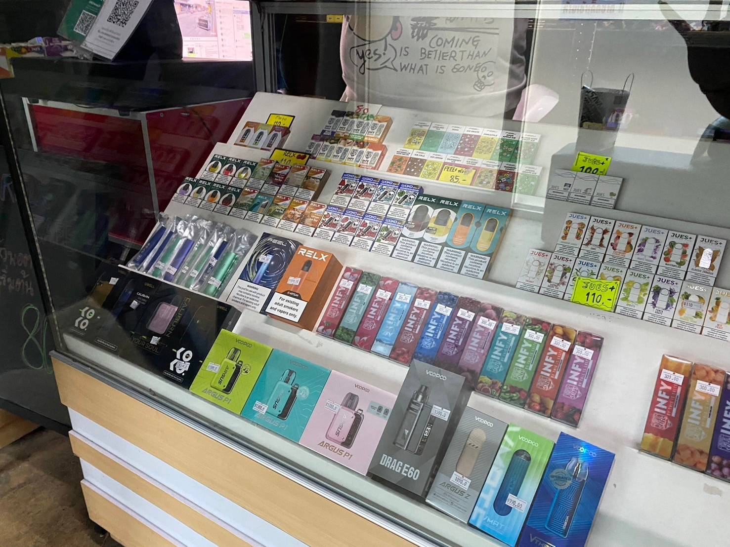 และจากการตรวจสอบการรับจ่ายเงินหรือเงินหมุนเวียนภายในร้าน พบแต่ละร้านมีรายได้ต่อวันตั้งแต่วันละ 10,000 – 40,000 บาทต่อวัน หรือตกเดือนละประมาณ 300,000 – 500,000 บาท ซึ่งจากการสอบถามผู้ดูแลพบ เจ้าของที่แท้จริงจะติดต่อผ่านไลน์และส่งของมาให้ขาย จึงไม่ทราบราคาต้นทุนต่อชิ้น และจะขายบุหรี่ไฟฟ้าและอุปกรณ์ตั้งแต่ราคาหลักสิบ ถึง หลักพันบาท