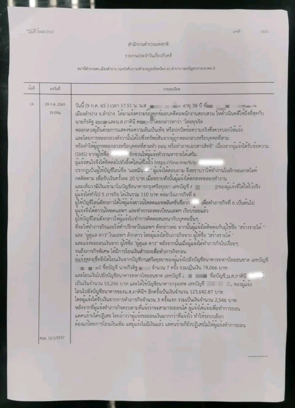 ผู้สื่อข่าวได้รับการติดต่อจากผู้เสียหายรายหนึ่ง เป็นหญิงอายุ 38 ปี ชาว อ.เมืองลำปาง ซึ่งได้ถูกหลอกให้ทำงานผ่านแอปพลิเคชั่น โดยให้โอนเงินสำรองจ่าย และจะโอนเงินคืนรวมทั้งรายได้จากการทำงานคืนให้ ซึ่งในตอนแรกได้เงินตามปกติ เมื่อยอดเงินเพิ่มขึ้นกลับไม่สามารถถอนเงินออกได้ สุดท้ายจึงรู้ว่าโดนหลอก จึงอยากฝากเตือนประชาชน และขอให้ผู้ที่โดนหลอกในลักษณะเดียวกันเข้าแจ้งความดำเนินคดีเพื่อจะได้เป็นคดีพิเศษ