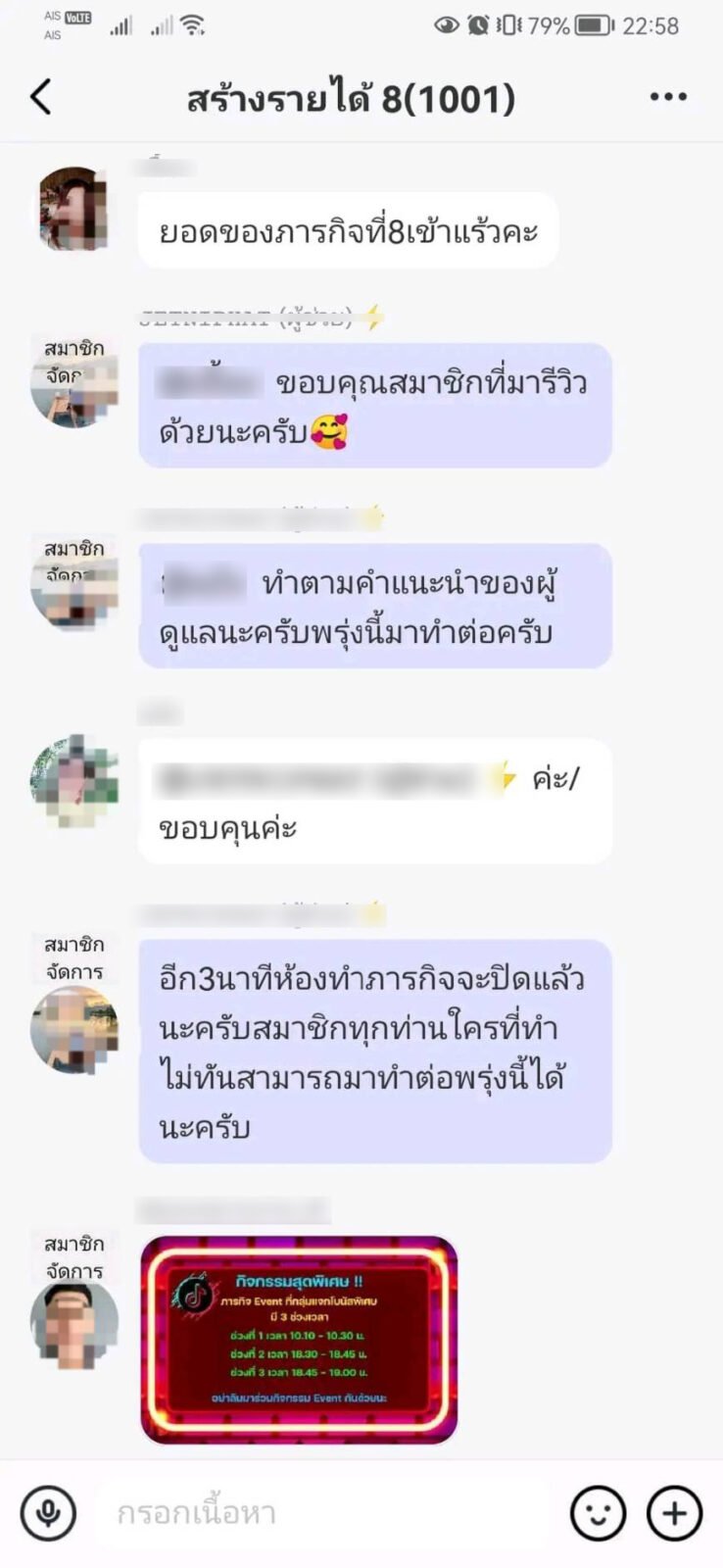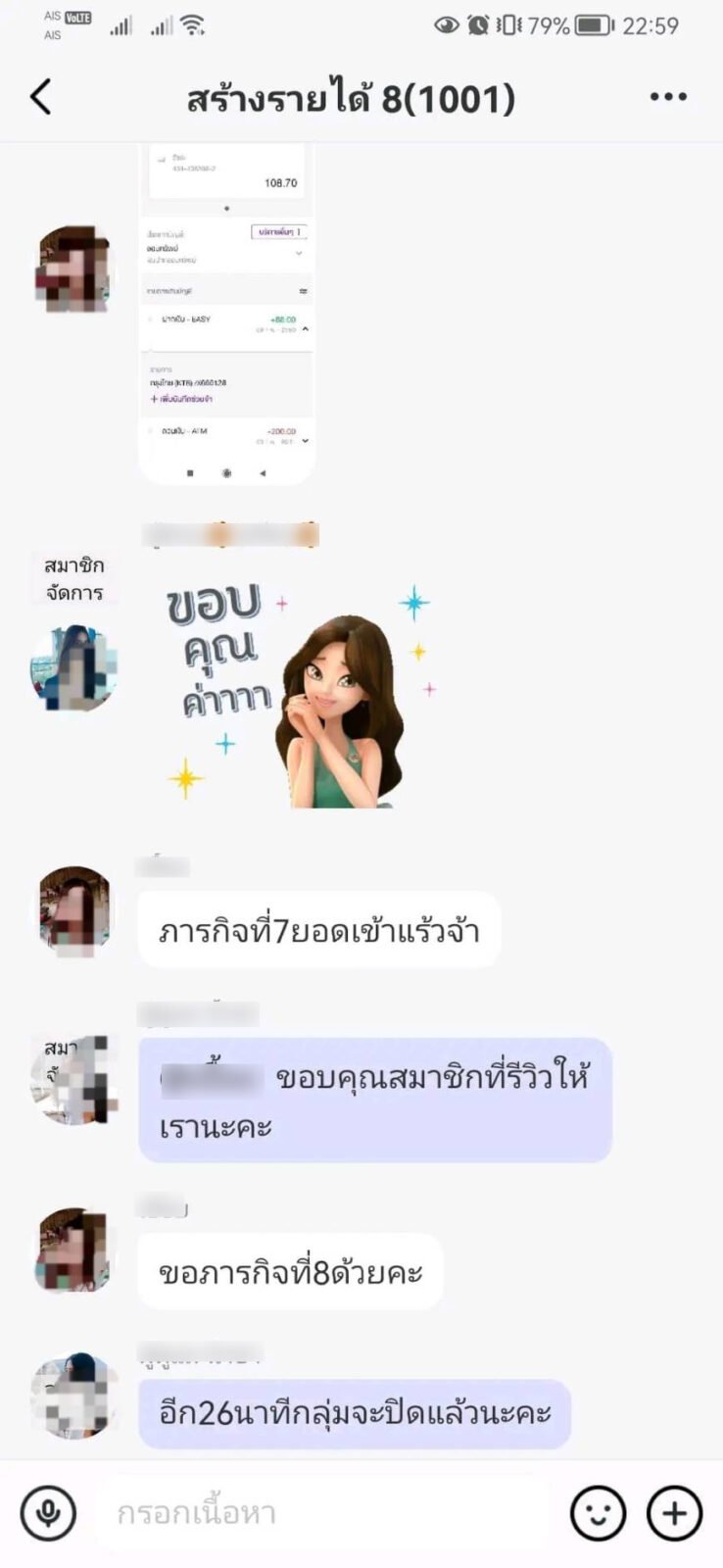 จากนั้นทางแอดมินก็แนะนำให้โหลดแอพพลิเคชั่นดังกล่าว และเข้าไปเช็คอินเพื่อทำภารกิจต่อ ตนเองกำลังว่างงานพอดี เลยหางานเพื่อต้องการรายได้เสริมเข้ามา จึงโหลดแอพฯ มาทำงานสลับกันกับการกดไลค์ในลิ้งที่ส่งมา และทำภารกิจที่จะต้องโอนเงินไปสำรองก่อน จากนั้นทางแอพฯ ได้โอนเงินคืนมาพร้อมกำไร ต่อมาก็ได้ทำภารกิจที่ต้องสำรองเงินเพิ่มขึ้นเรื่อยๆ ภารกิจสุดท้ายโอนไป 12,888 บาท ซึ่งได้มีการโอนคืนเงินให้ในแอพฯ แต่ตนก็ไม่สามารถถอนเงินออกได้ ซึ่งทางแอพได้ระบุว่าจะต้องทำภารกิจให้เสร็จ 4 ภารกิจก่อน โดยให้โอนเงินเข้าไปเรื่อยๆ จนทำภารกิจให้ครบ