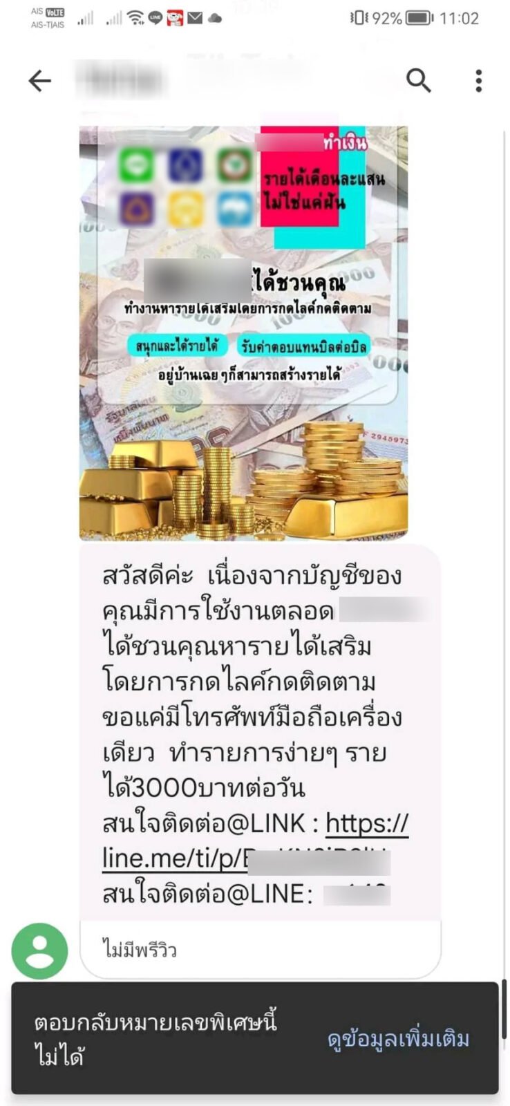 สาวลำปาง หวังหารายได้เสริมช่วงตกงาน จึงกดลิ้งสมัครทำงานออนไลน์ที่ส่งมาจาก SMS ของแอปดัง กลับถูกหลอก สูญเงินกว่า 2.6 แสน หากใครถูกหลอกรีบมาแจ้งเพื่อจะได้เป็นคดีพิเศษ