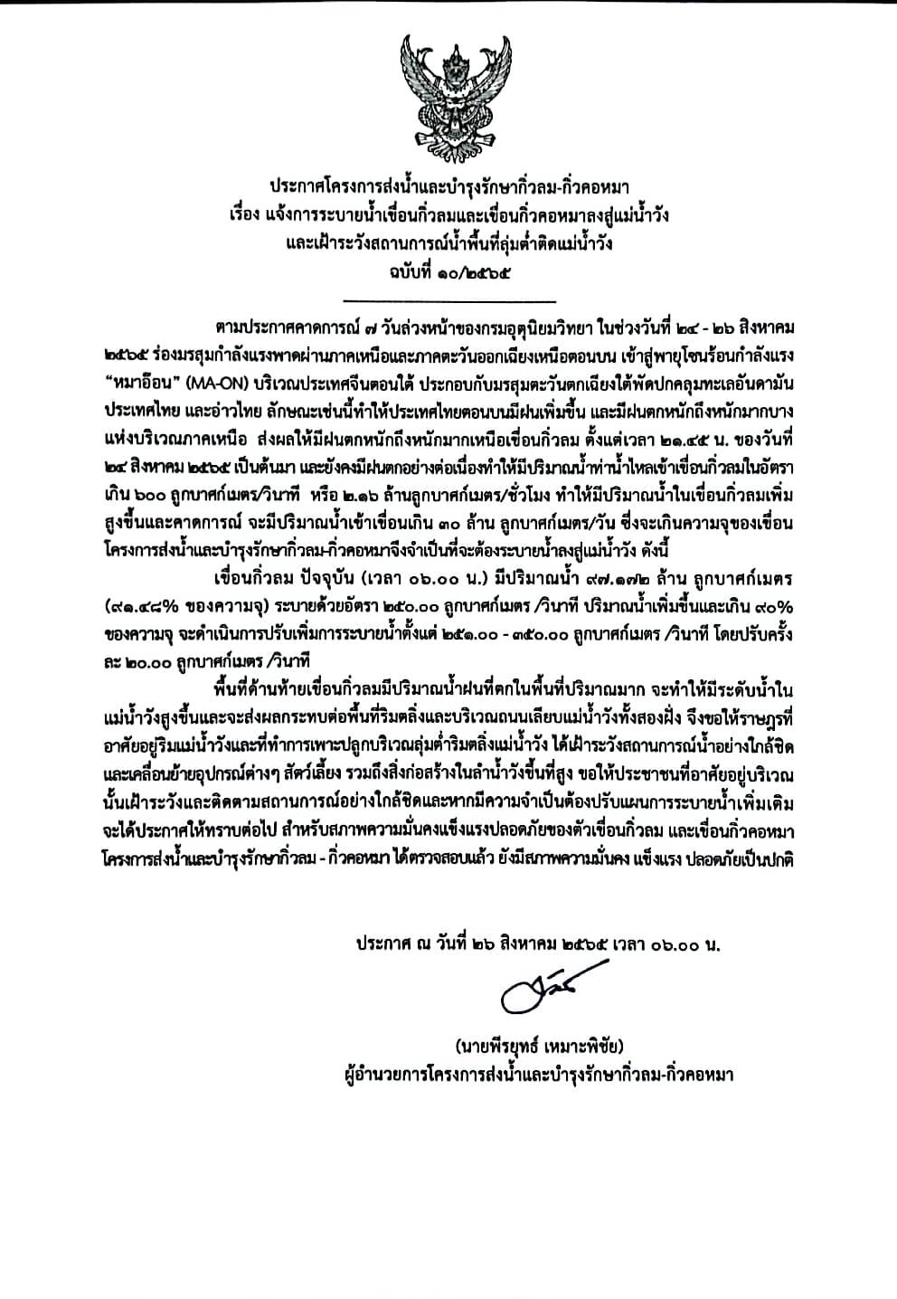 เช้าวันนี้ (26 สิงหาคม 2565) นายพีรยุทธิ์ เหมาะพิชัย ผู้อำนวยการโครงการส่งน้ำและบำรงรักษากี่วลม-กิ่วคอหมา ทำหนังสือแจ้ง เรื่อง แจ้งการระบายน้ำเขื่อนกิ่วลมและเขื่อนกิ่วคอหมาลงสูแม่น้ำวัง และเฝ้าระวังสถานการณ์น้ำพื้นที่ลุ่มต่ำติดแม่น้ำวัง ฉบับที่ 10/2565