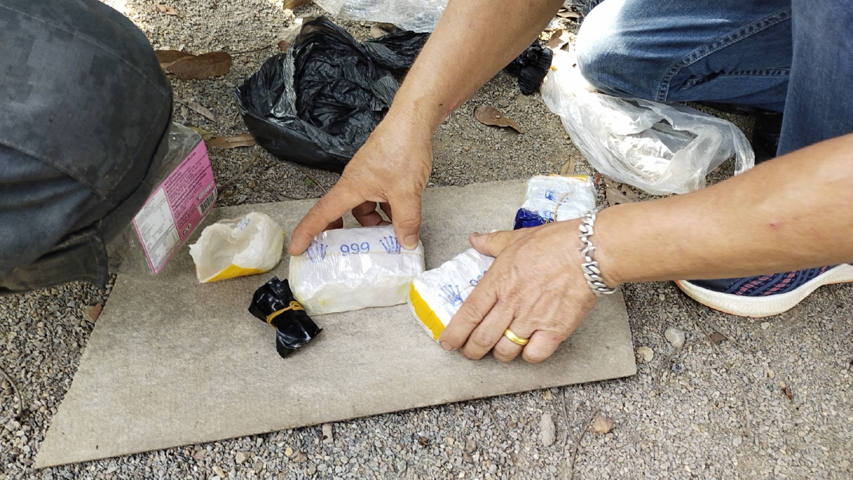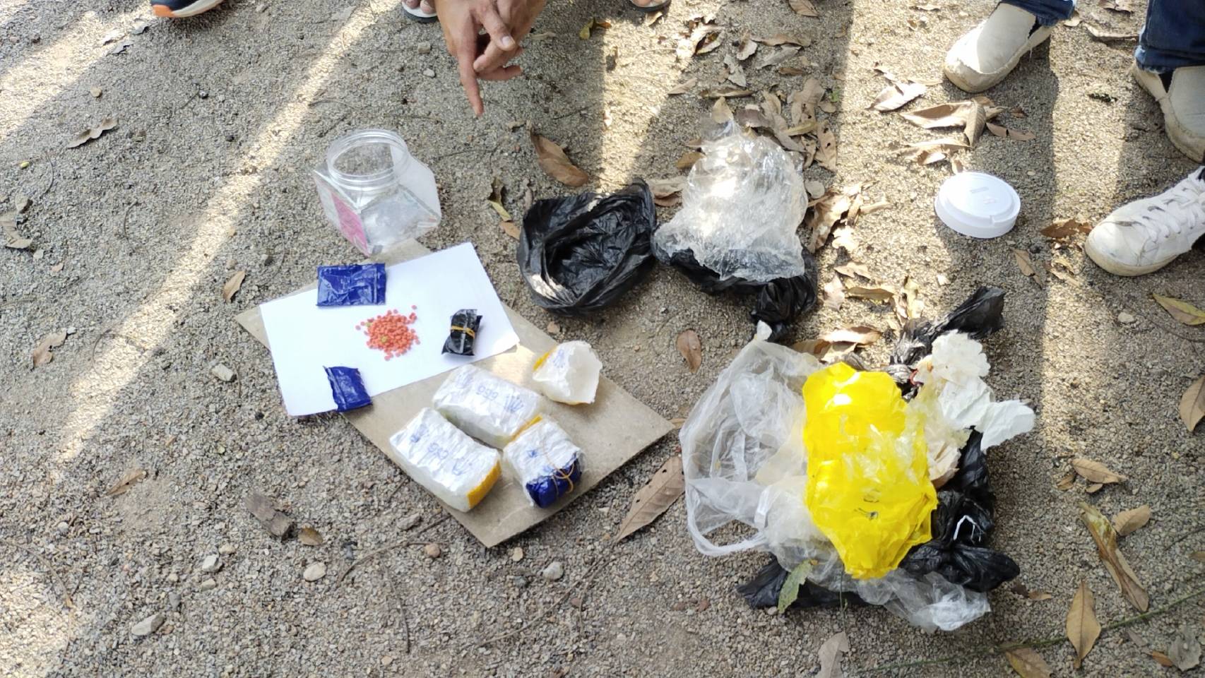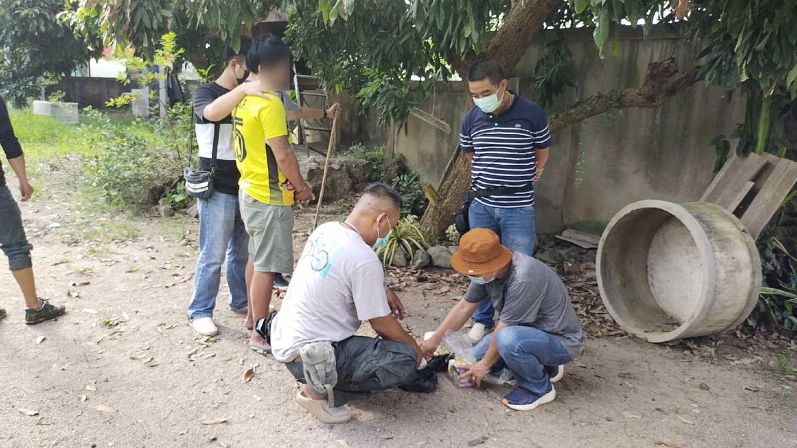 ตำรวจจึงขอทำการตรวจค้น และพบยาบ้าจำนวน 10 เม็ด บรรจุอยู่ในซองบรรจุยา มีผนึกปิดเปิด จำนวน 1 ถุง, ยาไอซ์ จำนวน 2.1 กรัม บรรจุในถุงพลาสติกใส มีผนึกปิดเปิด จำนวน 1 ถุง ซุกซ่อนอยู่ใต้หมอน ในห้องนอน โดยนายแบ๊งค์ กล่าวว่าของกลางทั้งหมดเป็นของตนเองแจึงควบคุมตัวไปตรวจค้นบริเวณรอบบ้านและพบกระดาษเทียนไขซึ่งใช้สำหรับบรรจุยาบ้า ซุกซ่อนอยู่ใต้เสาคอนกรีต ด้านหลังบ้าน เจ้าหน้าที่จึงตรวจค้นอย่างละเอียด พบยาบ้าจำนวนประมาณ 4,600 บรรจุอยู่กระดาษสาสีขาว มีอักษรหมายเลข 999 และเครื่องหมายมุงกุฎ ทั้งสองข้างของหมายเลข 999 ห่อด้วยกระดาษสา สีขาว จำนวนครึ่งห่อ อยู่ถุงพลาสติกสีดำ ในกล่องพลาสติก ขนมปัง วางอยู่บนกำแพงรั้วอิฐบล็อกบริเวณใต้ต้นลำไย จากการตรวจค้นพบของกลางทำให้นายแบ๊งค์ เป็นลมล้มทั้งยืน และรับว่ายาบ้าเป็นของตนเอง จึงควบคุมตัวเอาไว้