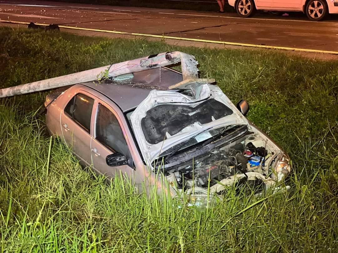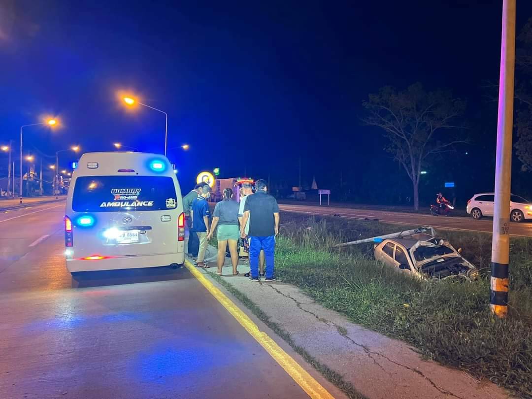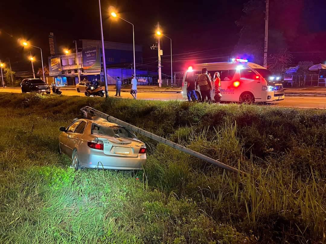 หญิงขับเก๋ง ประสบอุบัติเหตุ เสียหลักพุ่งชนเสาไฟฟ้า ได้รับบาดเจ็บ