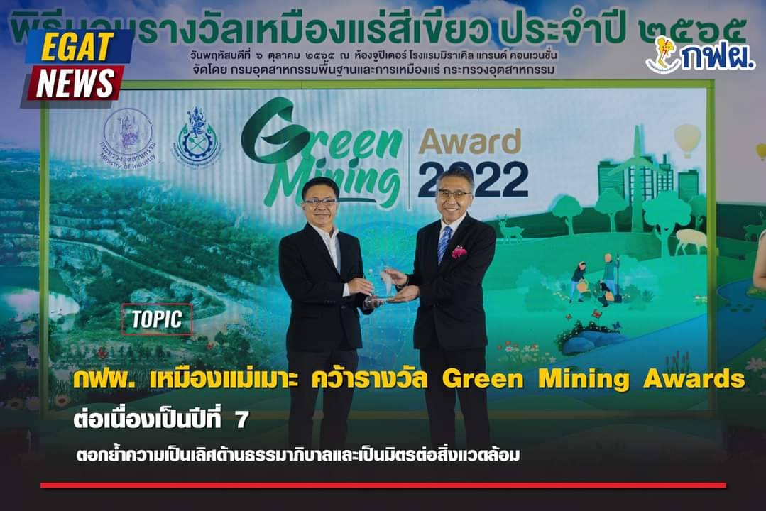 กฟผ.เหมืองแม่เมาะ คว้ารางวัล Green Mining Awards ต่อเนื่องเป็นปีที่ 7 ตอกย้ำความเป็นเลิศด้านธรรมาภิบาลและเป็นมิตรต่อสิ่งแวดล้อม