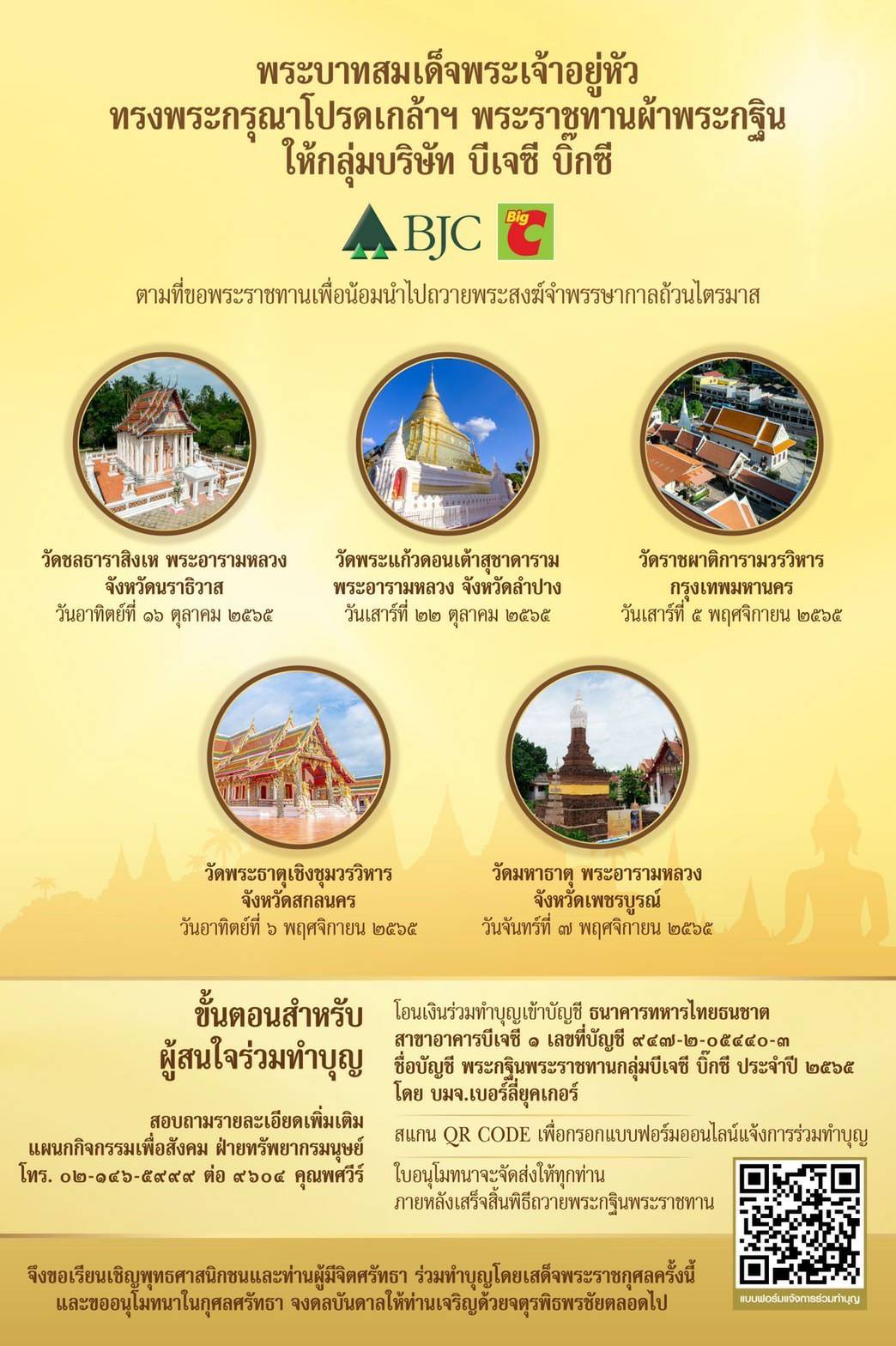 พระบาทสมเด็จพระเจ้าอยู่หัว ทรงพระกรุณาโปรดเกล้าฯ พระราชทาน ผ้าพระกฐินและเครื่องพระกฐินพระราชทาน ให้กลุ่มบีเจซี บิ๊กซี นำไปถวายพระสงฆ์จำพรรษากาลถ้วนไตรมาส ณ วัดพระแก้วดอนเต้าสุชาดาราม พระอารามหลวง