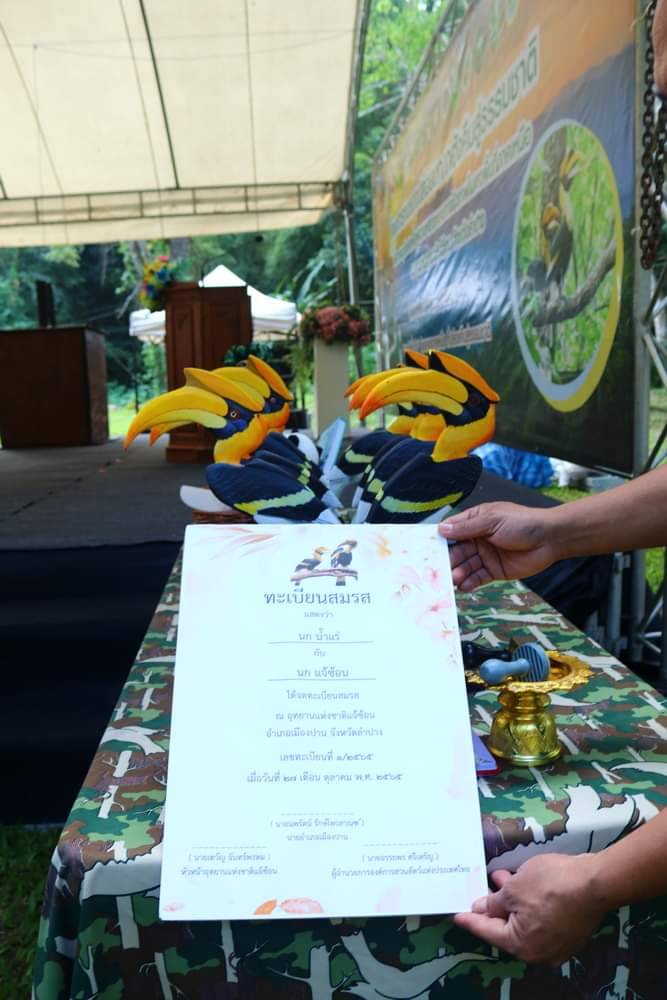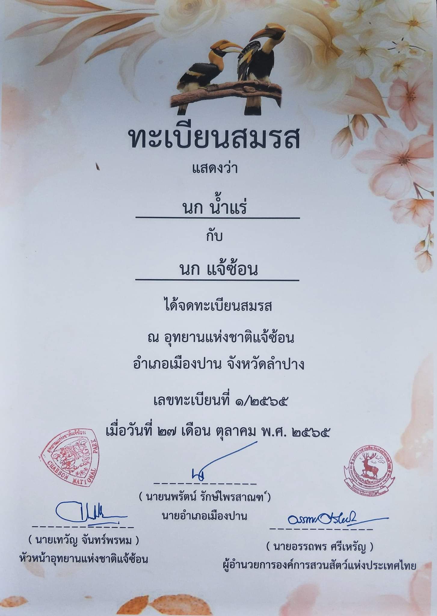 ทั้งนี้ นายนพรัตน์ รักษ์ไพรสาณฑ์ นายอำเภอเมืองปาน เป็นประธานในการทำพิธีจดทะเบียนสมรสของ นกน้ำแร่ กับ นกแจ้ซ้อน โดยมีนายอรรถพร ศรีเหรัญ ผู้อำนวยการ องค์การสวนสัตว์แห่งประเทศไทย เป็นผู้ใหญ่ฝ่ายชาย(นกน้ำแร่) และนายเทวัญ จันทร์พรหม หัวหน้าอุทยานแห่งชาติแจ้ซ้อน เป็นผู้ใหญ่ฝ่ายหญิง (นกแจ้ซ้อน) ร่วมลงนามเป็นพยาน