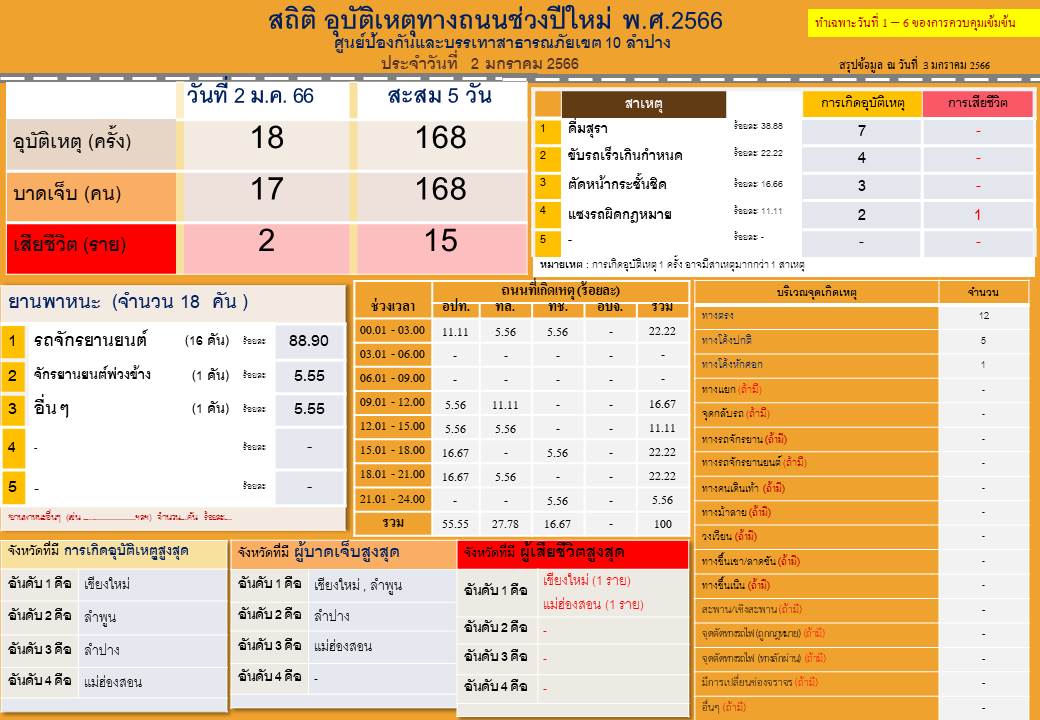 - อุบัติเหตุ จำนวน 168 ครั้ง (ลำปาง 55/ลำพูน 34/เชียงใหม่ 56/แม่ฮ่องสอน 23)
