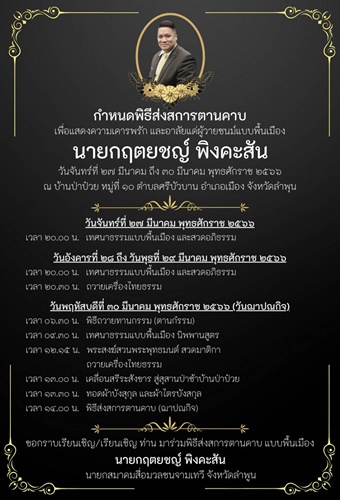 เมื่อวันที่ 28 มีนาคม 2566 เวลา 20.00 น. ที่ บ้านป๋าป๋วย ม.10 ตำบลศรีบัวบาน อำเภอเมือง จังหวัดลำพูน นายวรยุทธ เนาวรัตน์ (อดีตผู้ว่าราชการจังหวัดลำพูน) พร้อมด้วยภริยา นางปนัดดา เนาวรัตน์ นายชาตรี กิตติธนดิตถ์ (รองผู้ว่าราชการจังหวัดลำพูน) นางบำเพ็ญ (เมืองมูลพัฒนาชุมชนจังหวัดลำพูน) นายจรูญ คำปันนา(นายกเทศมนตรี เทศบาลตำบลศรีบัวบาน) และสำนักงานเหล่ากาชาดจังหวัดลำพูน พร้อมด้วยหัวหน้าส่วนราชการต่างๆ และผู้เข้าร่วมบำเพ็ญกุศลสวดพระอภิธรรมศพ นายกฤตยชญ์ พิงคะสัน (นายกสมาคมสื่อมวลชนจามเทวี ลำพูน) ที่ได้เสียชีวิตไป