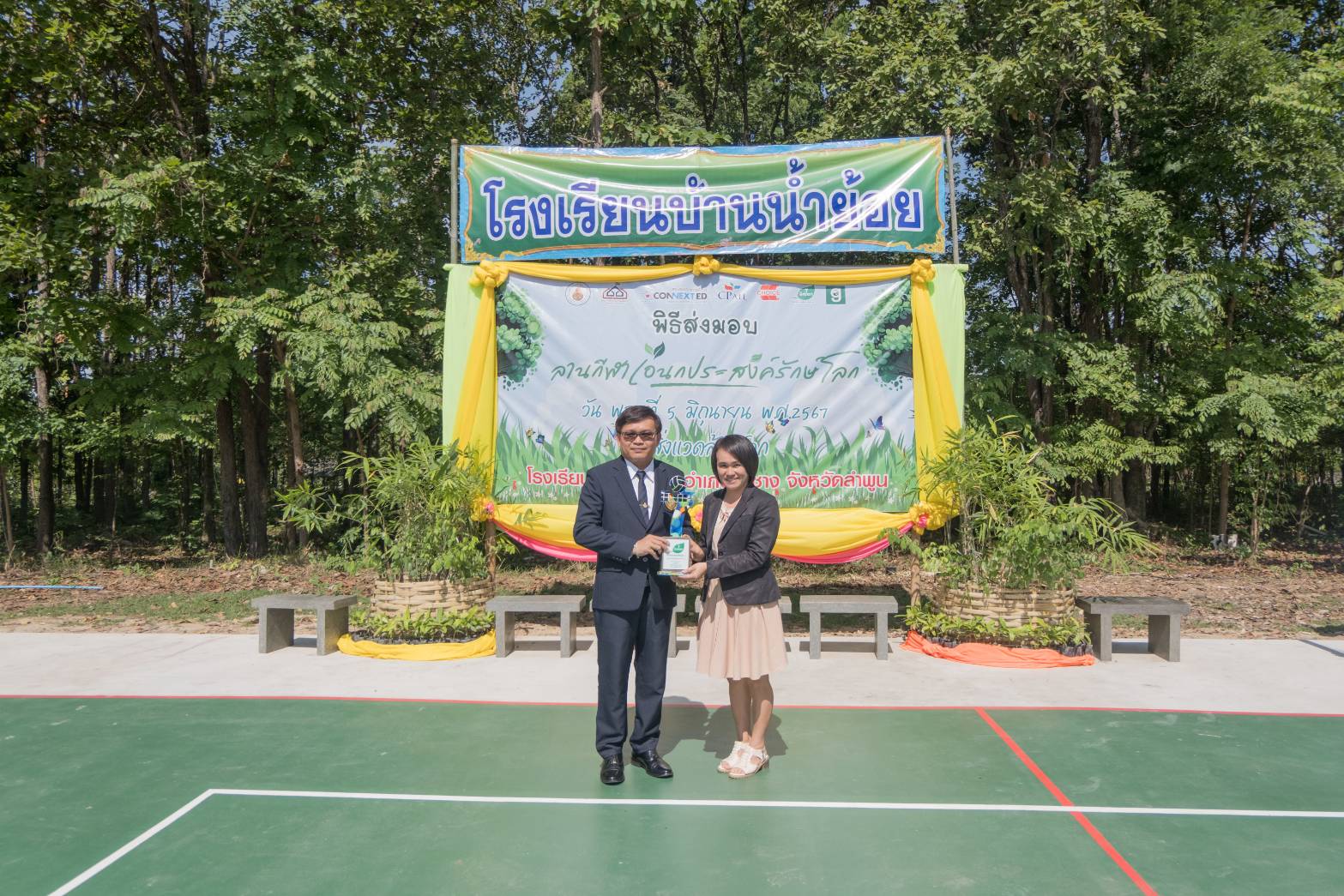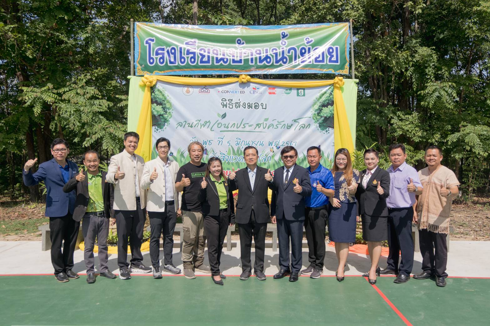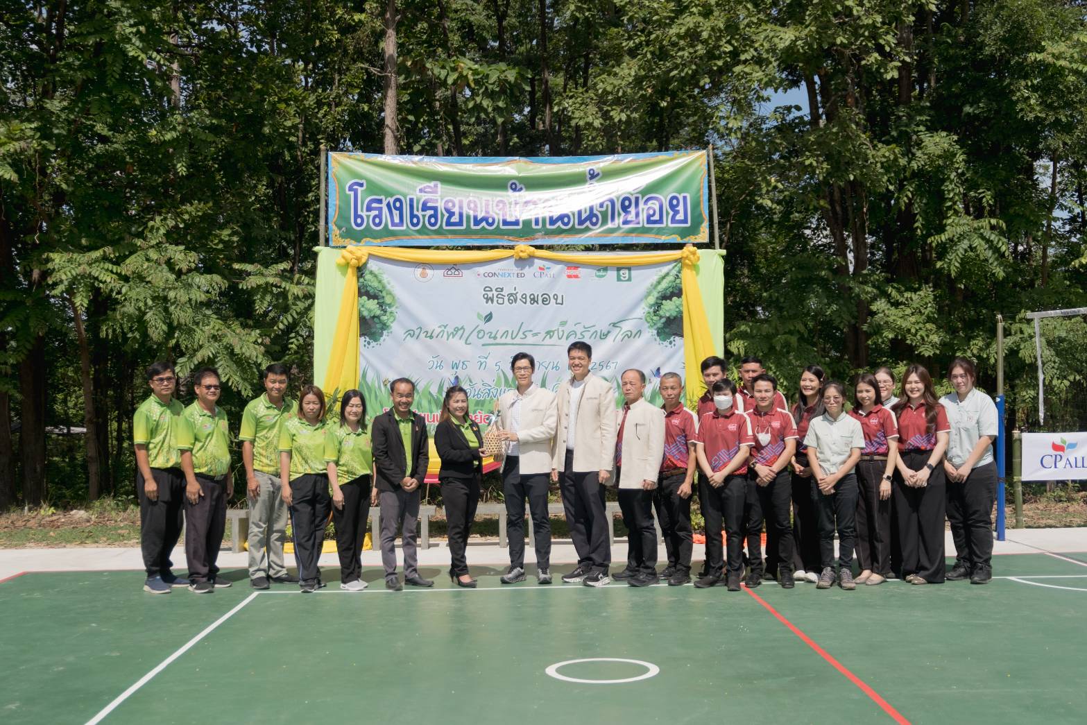 ภายในงาน นายประสิทธิ์ ฉกาจธรรม รองกรรมการผู้จัดการ สายงานพัฒนาความยั่งยืน บมจ.ซีพี ออลล์ เป็นประธานในพิธีเปิด พร้อมด้วย นายบวรเวทย์ ตันตรานนท์ กรรมการผู้จัดการ (ร่วม) สายงานปฏิบัติการ บริษัท ชอยส์ มินิ สโตร์ จำกัด, ผศ.ดร.เวชสวรรค์ หล้ากาศ อาจารย์ประจำภาควิชาเทคโนโลยีอุตสาหกรรม คณะวิทยาศาสตร์และเทคโนโลยี มหาวิทยาลัยราชภัฏเชียงใหม่ เจ้าของเพจ Green Road, นางสาวสกุณา นันธะชัยเดชากุล ผู้อำนวยการโรงเรียนบ้านน้ำย้อย จ.ลำพูน และ ดร.กฤติน พันธุ์เสนา รองผู้อำนวยการสำนักงานเขตพื้นที่การศึกษาประถมศึกษาลำพูน เขต 1 ร่วมพิธีเปิดและส่งมอบ “ลานกีฬาเอนกประสงค์รักษ์โลก” อีกทั้งภายในงานมีการจัดแข่งขันวอลเลย์บอลรอบชิงชนะเลิศและมอบถ้วยรางวัลที่ทำจากพลาสติกกำพร้าให้กับทีมชนะเลิศ ซึ่งบรรยากาศภายในงานเต็มไปด้วยรอยยิ้มและความประทับใจของทุกคน