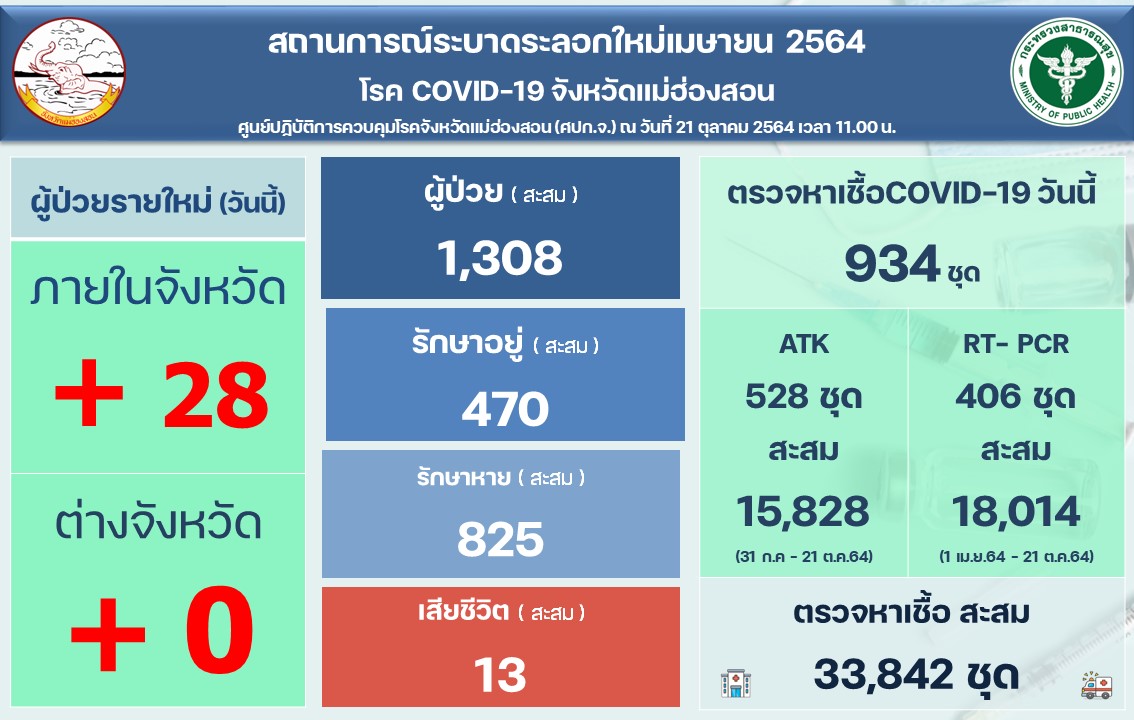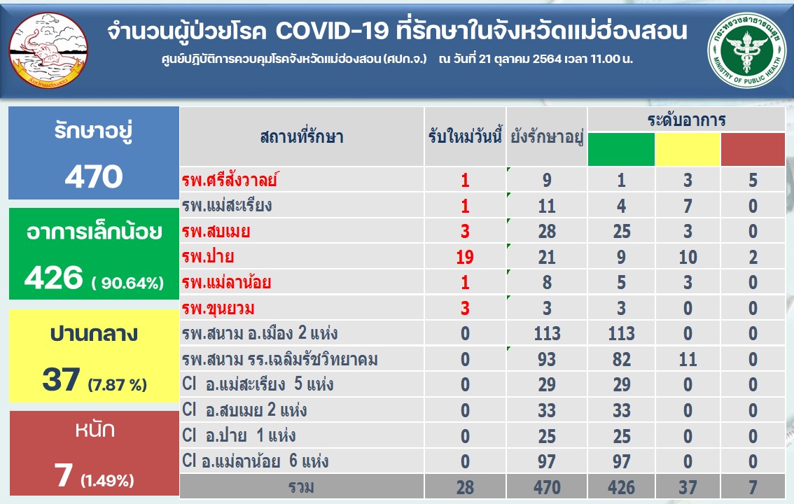 สรุป สถานการณ์ ณ วันที่ 21 ตุลาคม 2564 จังหวัดแม่ฮ่องสอนมีผู้ติดเชื้อไวรัสโคโรนา 2019ระลอกเมษายน จำนวน 1,308 ราย เป็นเพศชาย 618 ราย และเพศหญิง 690 ราย เสียชีวิต 13 ราย (0.99%) รักษาหายแล้ว 825 ราย (63.07%) ยังอยู่ระหว่างรักษา 470 ราย.(35.94%) มีอาการเล็กน้อย 426 ราย ปานกลาง 37 ราย และรุนแรง 7 ราย รักษาอยู่ที่โรงพยาบาลศรีสังวาลย์ 9 ราย โรงพยาบาลแม่สะเรียง 11 ราย โรงพยาบาลปาย 21 ราย โรงพยาบาลสบเมย 28 ราย โรงพยาบาลขุนยวม 3 ราย โรงพยาบาลแม่ลาน้อย 8 รายโรงพยาบาลสนาม 206 ราย และรักษาในศูนย์แยกกักโรคชุมชน (CI) 184 ราย