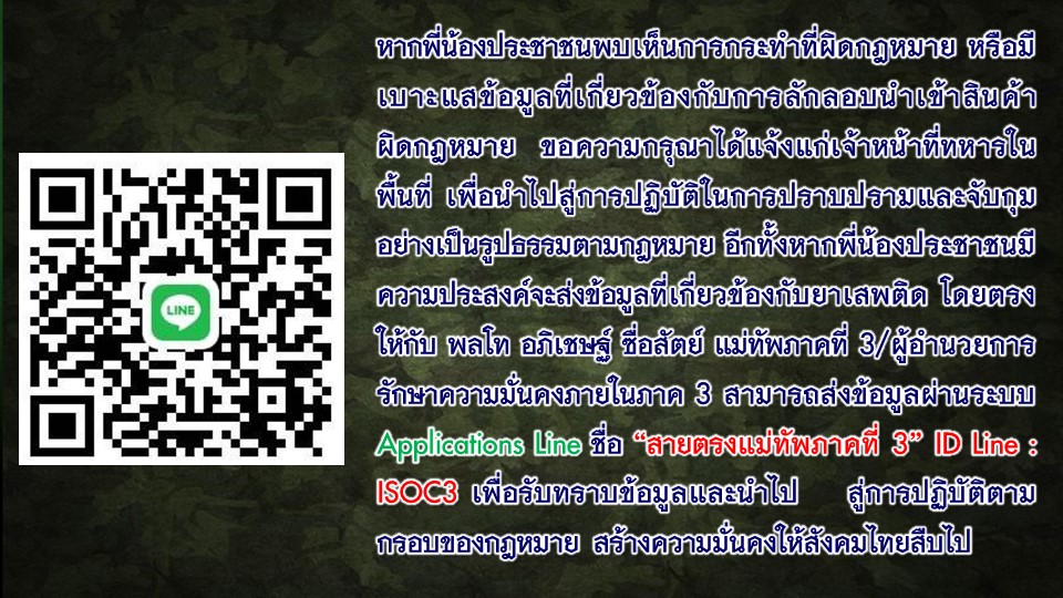 ทั้งนี้ หากพี่น้องประชาชนพบเห็นการกระทำใดที่ผิดกฎหมาย หรือมีเบาะแสข้อมูลที่เกี่ยวข้องกับการลักลอบค้าอาวุธหรือขนส่งยุทธปัจจัยข้ามแดน ตลอดจนการกระทำผิดที่เกี่ยวกับอาวุธปืน เครื่องกระสุนปืน วัตถุระเบิด ดอกไม้เพลิง และสิ่งเทียม อาวุธปืน ขอความกรุณาได้แจ้งแก่เจ้าหน้าที่ทหารในพื้นที่ เพื่อนำไปสู่การปฏิบัติในการจับกุมดำเนินคดีอย่างเป็นรูปธรรมตามกฎหมาย อีกทั้งหากพี่น้องประชาชนมีความประสงค์จะส่งข้อมูลที่เกี่ยวข้องกับผู้กระทำผิดโดยตรง ให้กับ พลโท อภิเชษฐ์ ซื่อสัตย์ แม่ทัพภาคที่ 3/ผู้อำนวยการรักษาความมั่นคงภายในภาค 3 สามารถส่งข้อมูลผ่านระบบ Application Line ชื่อ “สายตรงแม่ทัพภาคที่ 3” ID Line : ISOC3 เพื่อรับทราบข้อมูลและนำไปสู่การปฏิบัติตามกรอบของกฎหมาย สร้างความมั่นคงให้สังคมไทยสืบไป