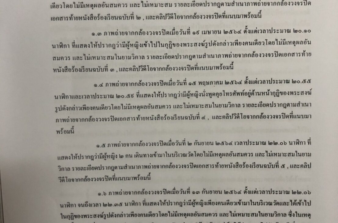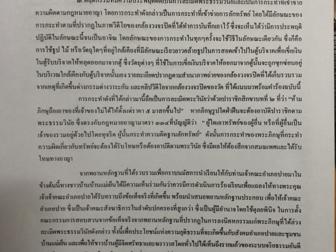 ด้วยเหตุที่ได้นมัสการกราบเรียนมาข้างต้นนี้ ทางชาวบ้านบ้านแม่เย็นจึงได้ร่วมปรึกษาหารือและมีความเห็นว่าควรมีการแจ้งเหตุนี้ให้กับทางพระคุณเจ้าท่านเข้าคณะอำเภอปายได้รับทราบ โคยการทำหนังสือร้องเรียนเพื่อแถลงให้ท่านเจ้ากณะอำเภอปายได้รับทราบถึงมูลเหตุแห่งการร้องเรียนมาในหนังสือฉบับนี้และขอส่งพยานหลักฐานที่ใช้ประกอบการพิจารณาไต่สวนความผิดต่อพระธรรมวินัยของพระสงฆ์รูปดังกถ่าวที่ทางชาวบ้านได้ช่วยกันเก็บรวบรวมมาเป็นระยะเวลานานหลายปี ซึ่งได้เกิดขึ้นต่างกรรมด่างวาระกัน ซึ่งจะประกอบไปด้วยพยานหลักฐานที่ทางชาวบ้านเห็นว่าน่าจะเป็นความผิดทั้งในค้านของเมถุนธรรม และในด้านของอทินนาทาน ซึ่งจะขอกล่าวแถลงให้ทางท่านเจ้าคณะอำเภอปายได้รับทราบดังต่อไปนี้