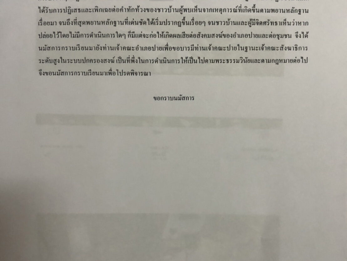 ทางชาวบ้านบ้านแม่เย็นจึงได้ร่วมปรึกษาหารือและมีความเห็นว่าควรมีการแจ้งเหตุนี้ให้กับทางพระคุณเจ้าท่านเข้าคณะอำเภอปายได้รับทราบ โคยการทำหนังสือร้องเรียนเพื่อแถลงให้ท่านเจ้ากณะอำเภอปายได้รับทราบถึงมูลเหตุแห่งการร้องเรียนมาในหนังสือฉบับนี้และขอส่งพยานหลักฐานที่ใช้ประกอบการพิจารณาไต่สวนความผิดต่อพระธรรมวินัยของพระสงฆ์รูปดังกถ่าวที่ทางชาวบ้านได้ช่วยกันเก็บรวบรวมมาเป็นระยะเวลานานหลายปี ซึ่งได้เกิดขึ้นต่างกรรมด่างวาระกัน ซึ่งจะประกอบไปด้วยพยานหลักฐานที่ทางชาวบ้านเห็นว่าน่าจะเป็นความผิดทั้งในค้านของเมถุนธรรม และในด้านของอทินนาทาน