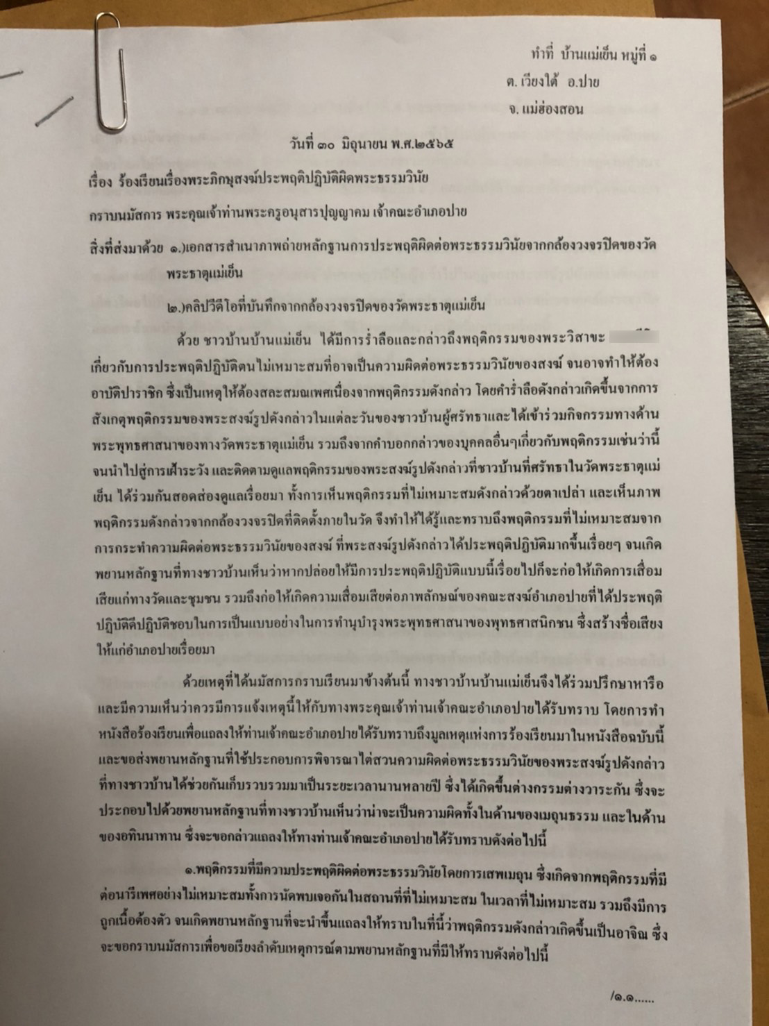 เมื่อวันที่ 3 กรกฎาคม 2565 นางสาวจุไรรัตน์ กันทาสุข ผู้ใหญ่บ้านแม่เย็น หมู่ 1 ต.แม่ฮี้ อ.ปาย จ.แม่ฮ่องสอน เปิดเผยว่า เมื่อวันที่ 2 ก.ค. 65 ที่ผ่านมา ตนได้เดินทางไปยื่นหนังสือร้องเรียนต่อ พระคุณเจ้าท่านพระครูอนุสาร ปุญญาคม เจ้าคณะอำเภอปาย และพระครูอนุสรณ์ จารุวรรณ เจ้าคณะตำบลเวียงหนือ เจ้าอาวาสวัดแม่ปิง พร้อมด้วย 1.) เอกสารสำเนาภาพถ่ายหลักฐานการประพฤติผิดต่อพระธรรมวินัยการลวนลามหญิงสาวที่ไปดูดวง จากกล้องวงจรปิดของวัคพระธาตุแม่เย็น 2.) คลิปวีดีโอ การลักทรัพย์ในเซฟบริจาคเงินของวัดแม่เย็นที่บันทึกจากกล้องวงจรปิดของวัดพระธาตุแม่เย็น