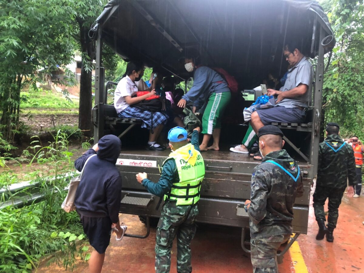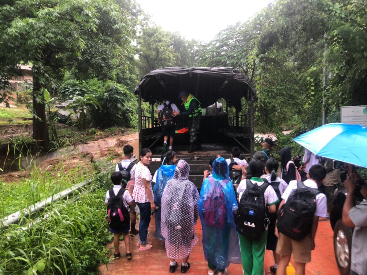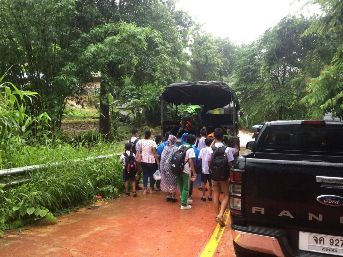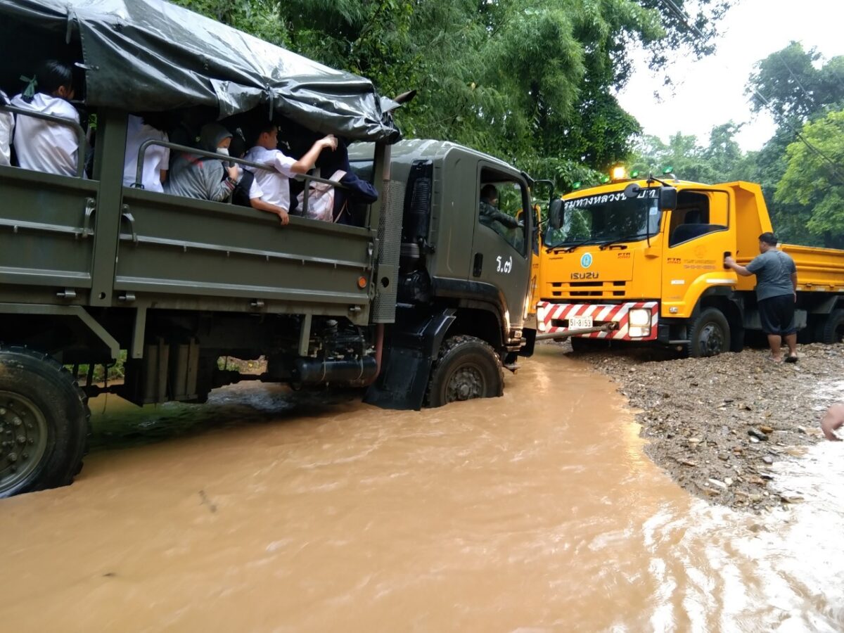 พายุใต้ฝุ่นมูหลานยังมาไม่ถึงเมืองสามหมอกแต่มีฝนตกหนักต่อเนื่องมาหลายวัน สุดท้ายน้ำท่วมทางเข้าหมู่บ้านห้วยเสือเฒ่า หมู่บ้านท่องเที่ยวกะเหรี่ยงคอยาวชื่อดัง เด็กนักเรียนกว่า 30 ชีวิตข้ามน้ำกลับบ้านไม่ได้ หน่วยทหารต้องจัดรถบรรทุกทหารขนกลับบ้านอย่างทุลักทุเล