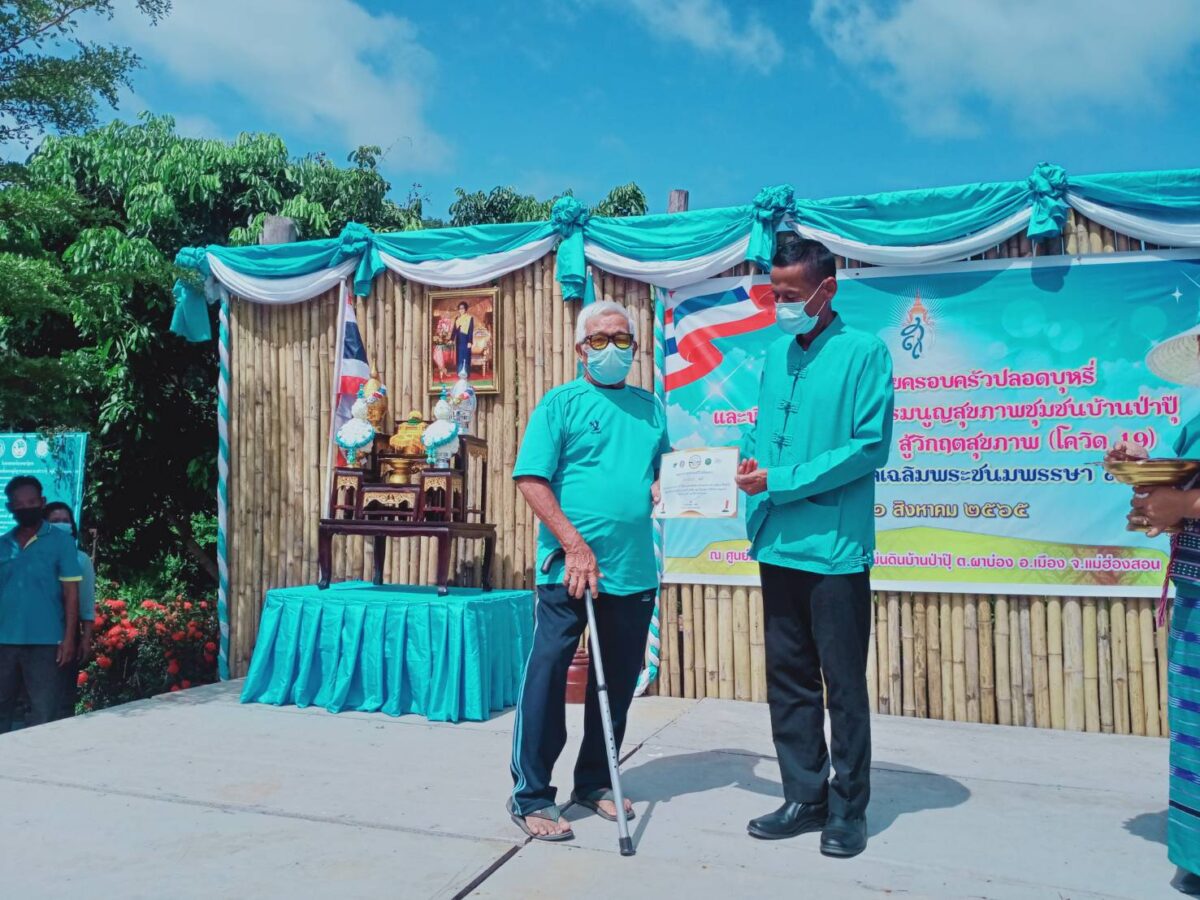 ในโอกาสนี้หัวหน้าครอบครัวบ้านปลอดบุหรี่ และผู้สูงอายุได้เข้ารับมอบป้ายบ้านปลอดบุหรี่และเงินกองทุนแม่ของแผ่นดินต่อหน้าพระบรมฉายาลักษณ์สมเด็จพระนางเจ้าสิริกิติ์พระบรมราชินีนาถพระบรมราชชนนีพันปีหลวง และรับมอบใบประกาศเกียรติบัตรบุคคลต้นแบบเลิกบุหรี่จากนายพงษ์พีระ ชูชื่น นายอำเภอเมืองแม่ฮ่องสอนประธานในพิธี จากนั้นมีพิธีลงนามในเอกสารและลงนามในแผ่นไวนิลในการประกาศใช้ธรรมนูญสุขภาพชุมชนบ้านป่าปุ๊รองรับสังคมสูงวัยสู้วิกฤตสุขภาพ (โควิด 19 ) ฉบับที่ 1 พ.ศ. 2565 เพื่อบรรลุสู่เป้าหมายร่วม “ชุมชนอยู่ดี มีสุข “