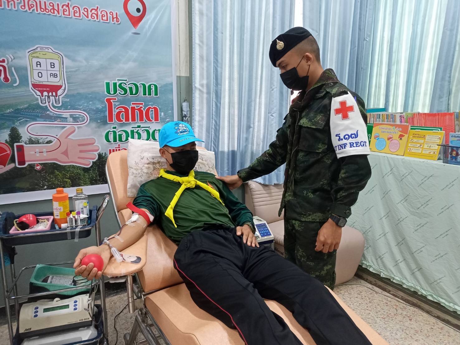 หน่วยเฉพาะกิจ กรมทหารราบที่ 17 จัดกำลังพลบริจาคโลหิตให้กับ ผู้ใหญ่บ้านหนองแห้ง หมู่ 9 ต.เมืองปอน อ.ขุนยวม จ.แม่ฮ่องสอน ที่ป่วยหนัก