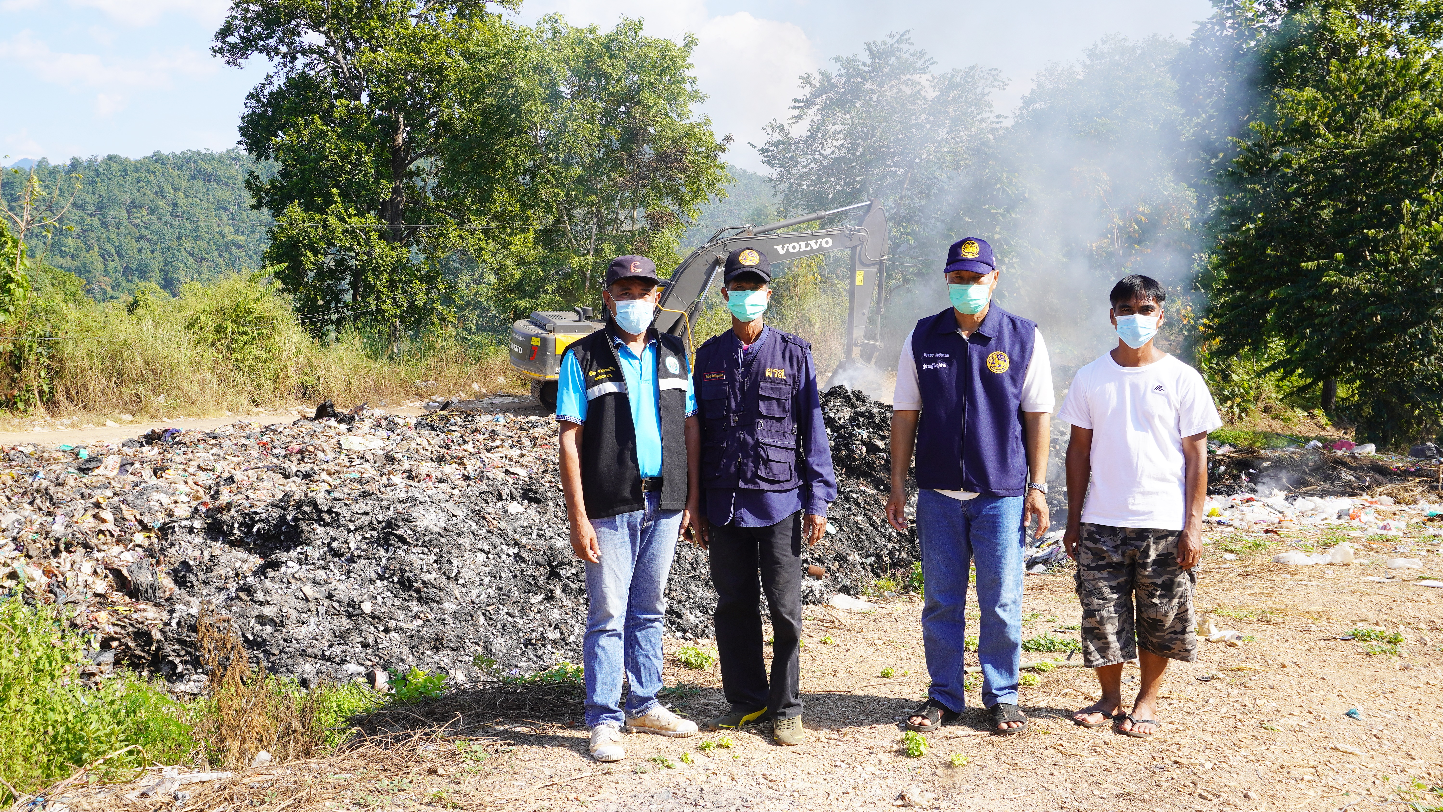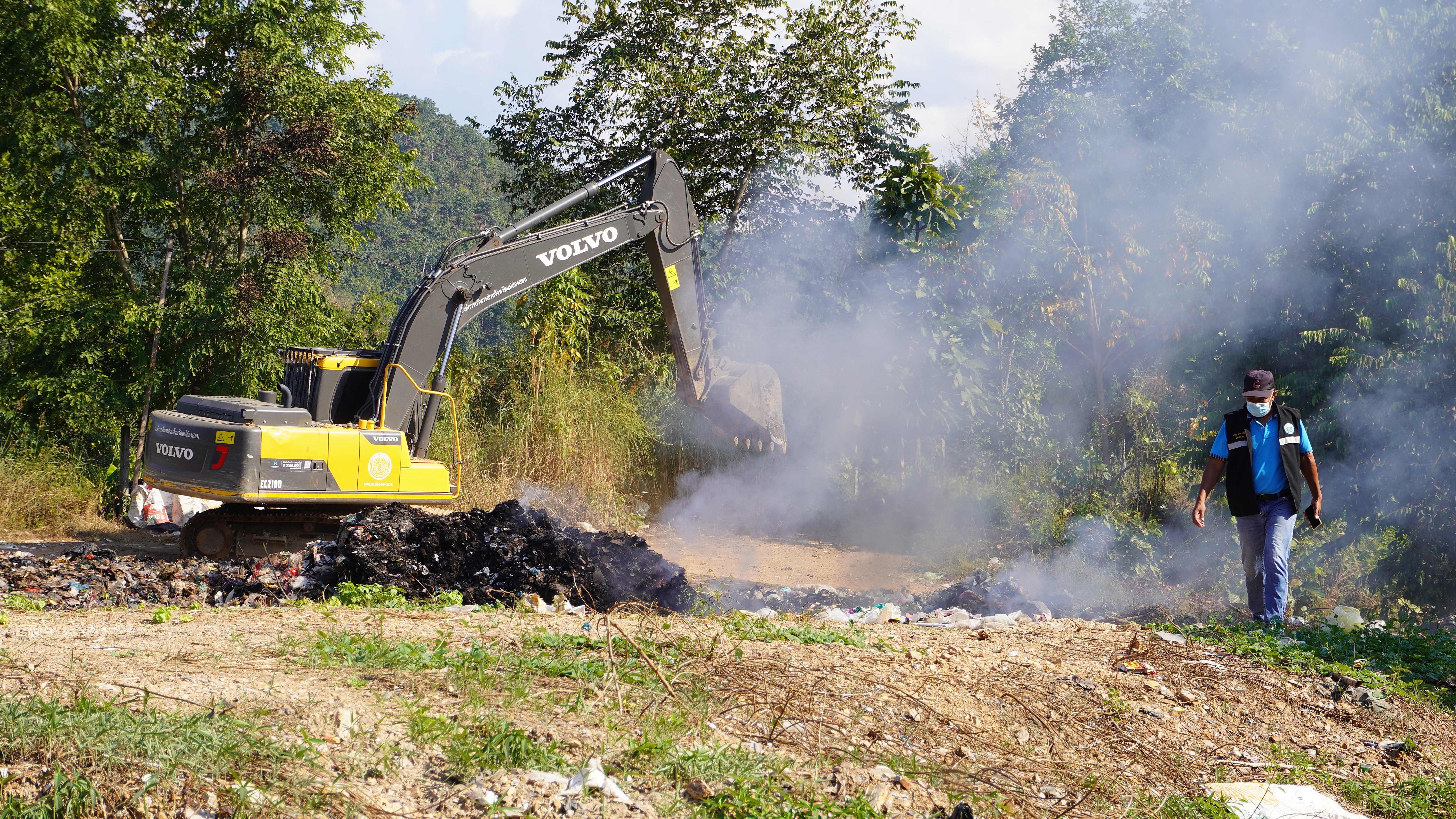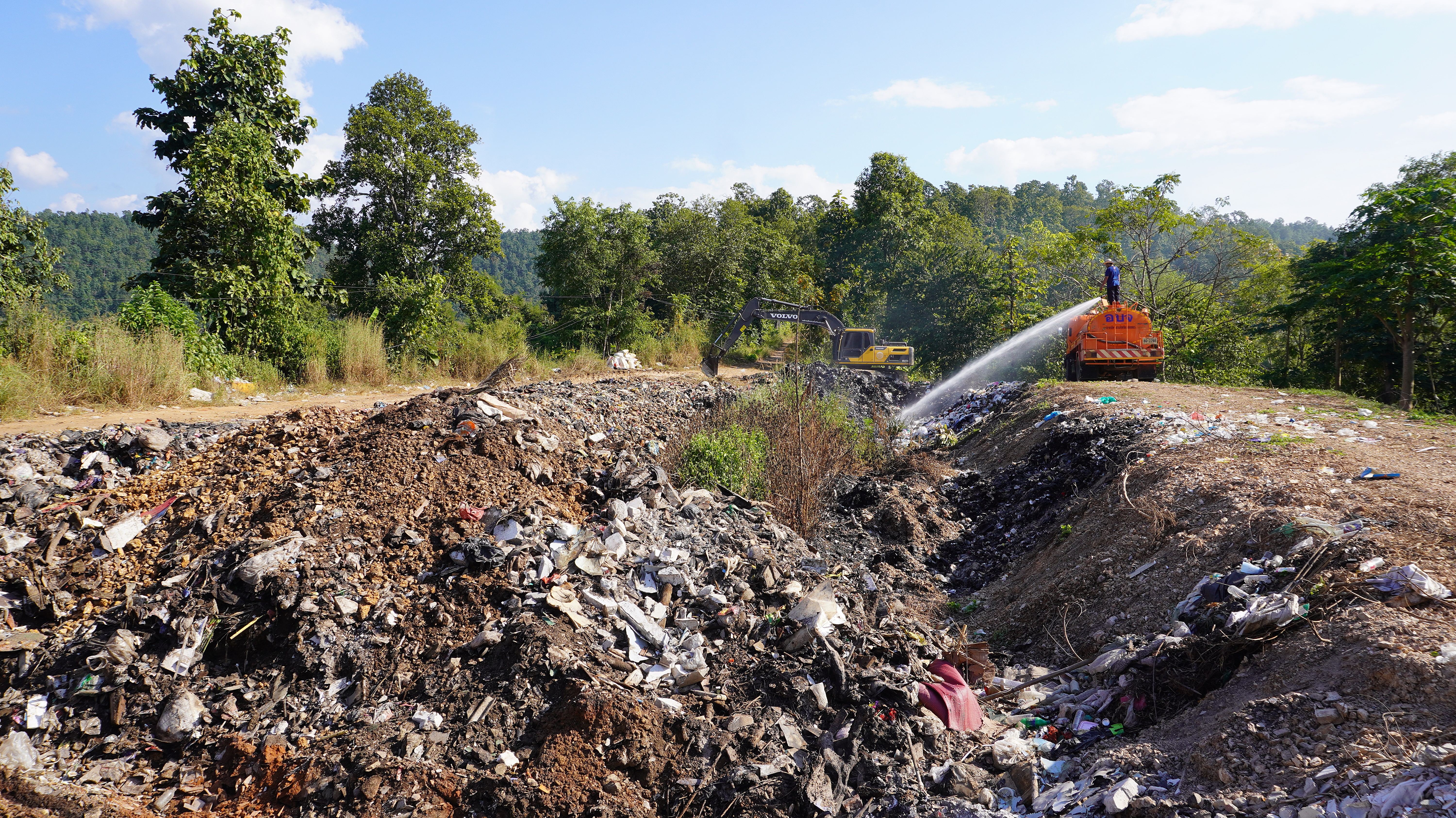 อบจ.แม่ฮ่องสอน ส่งเครื่องรถแบ็คโฮกลบฝังขยะ พร้อมรถน้ำฉีดพ่น หลังเกิดไฟไหม้บ่อขยะที่บ้านทุ่งกองมู สร้างมลพิษทางอากาศ ชาวบ้านเดือดร้อนเป็นเวลาเกือบเดือน