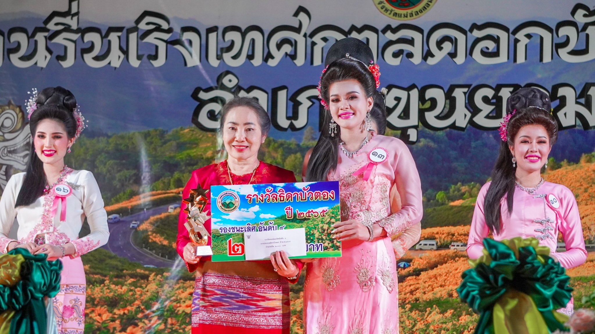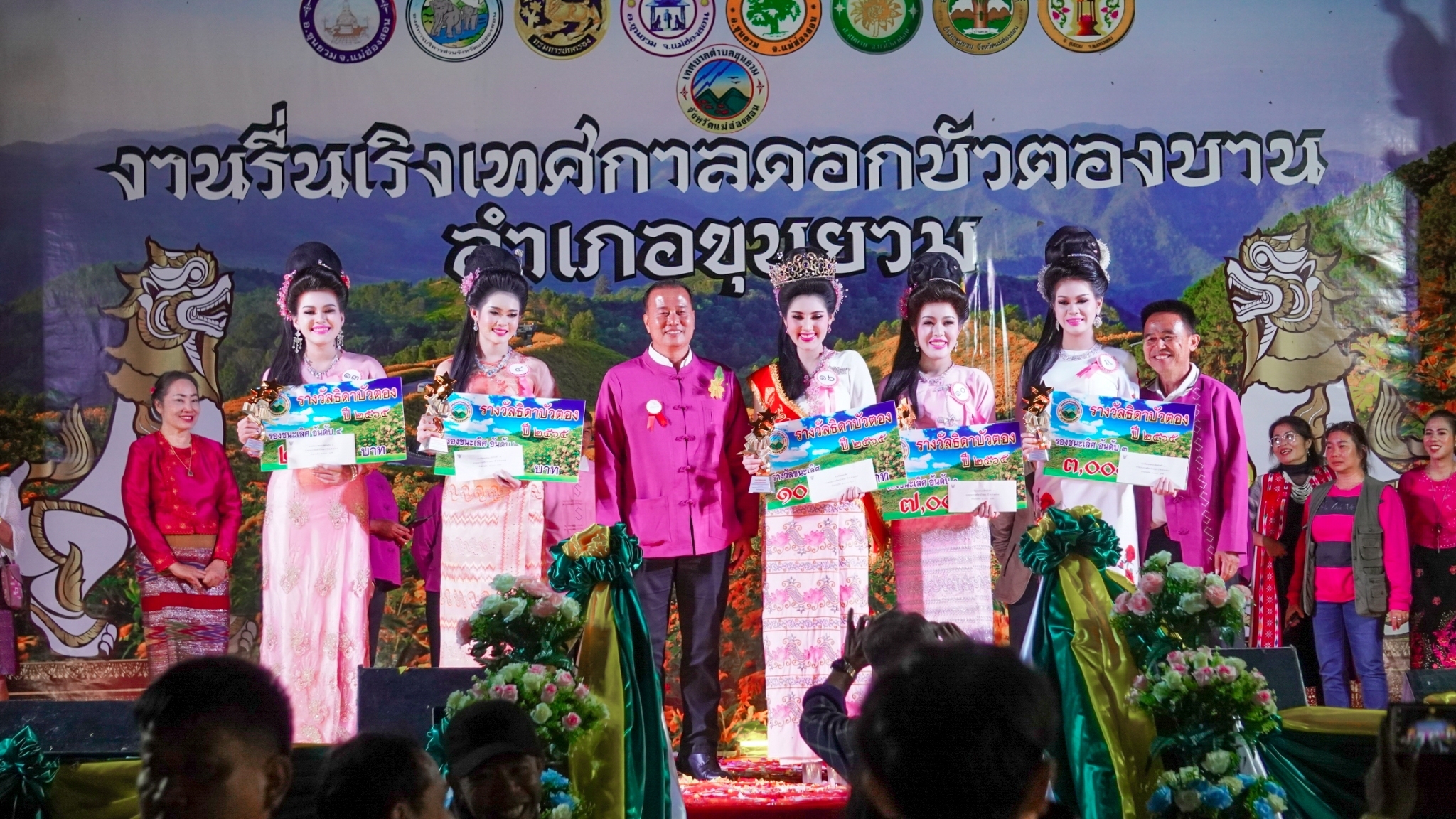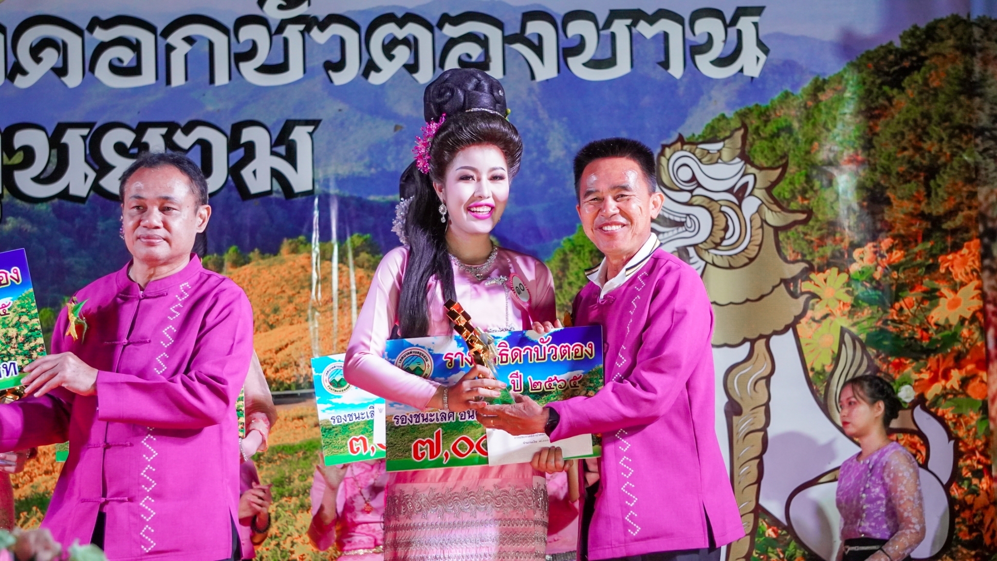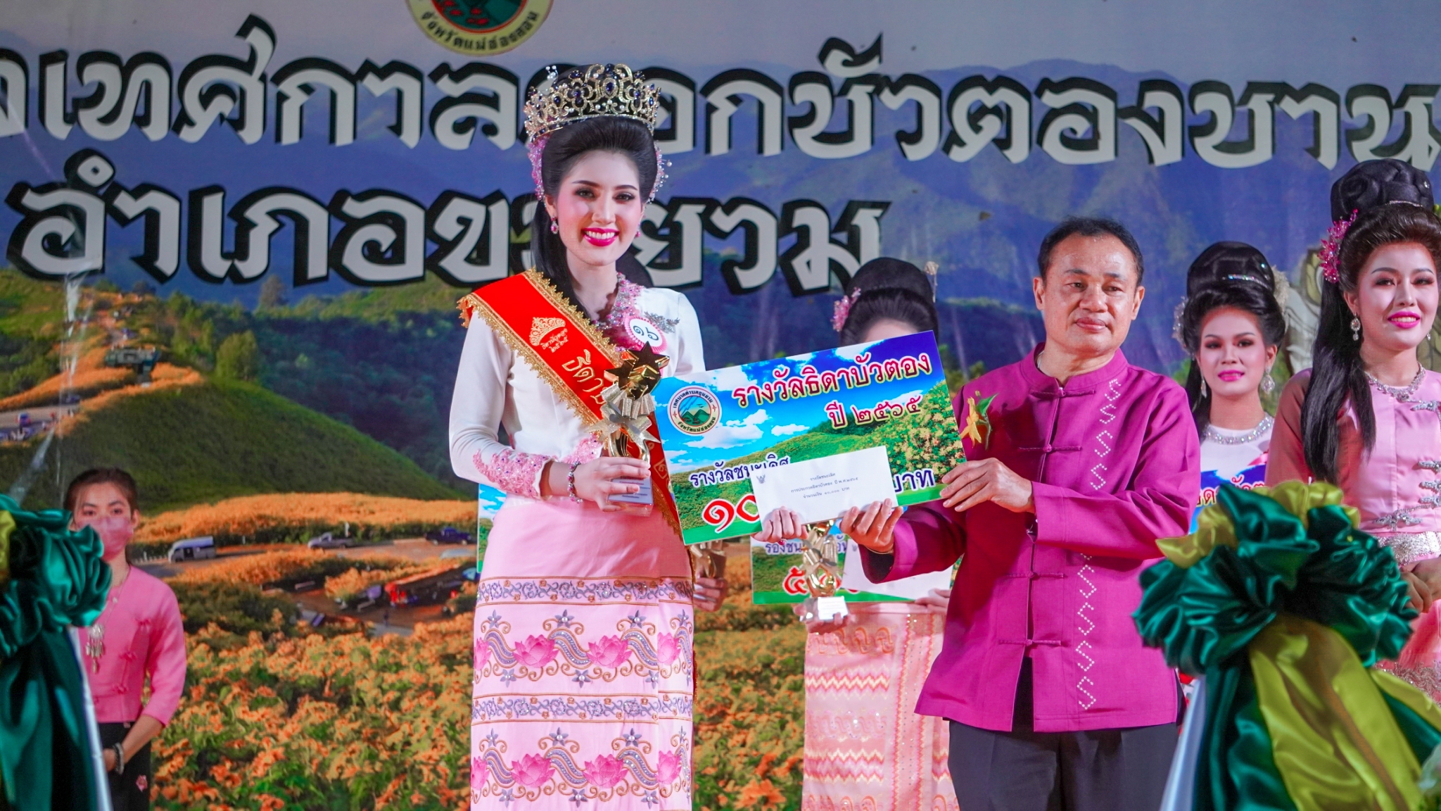 งานรื่นเริงเทศกาลดอกบัวตองบานที่ อ.ขุนยวม จ.แม่ฮ่องสอน มีการประกวดธิดาบัวตอง ในปีนี้สาวงามที่คว้าชัย เป็นสาวงามจาก อบต.แม่อูคอ เจ้าถิ่นในทุ่งบัวตอง