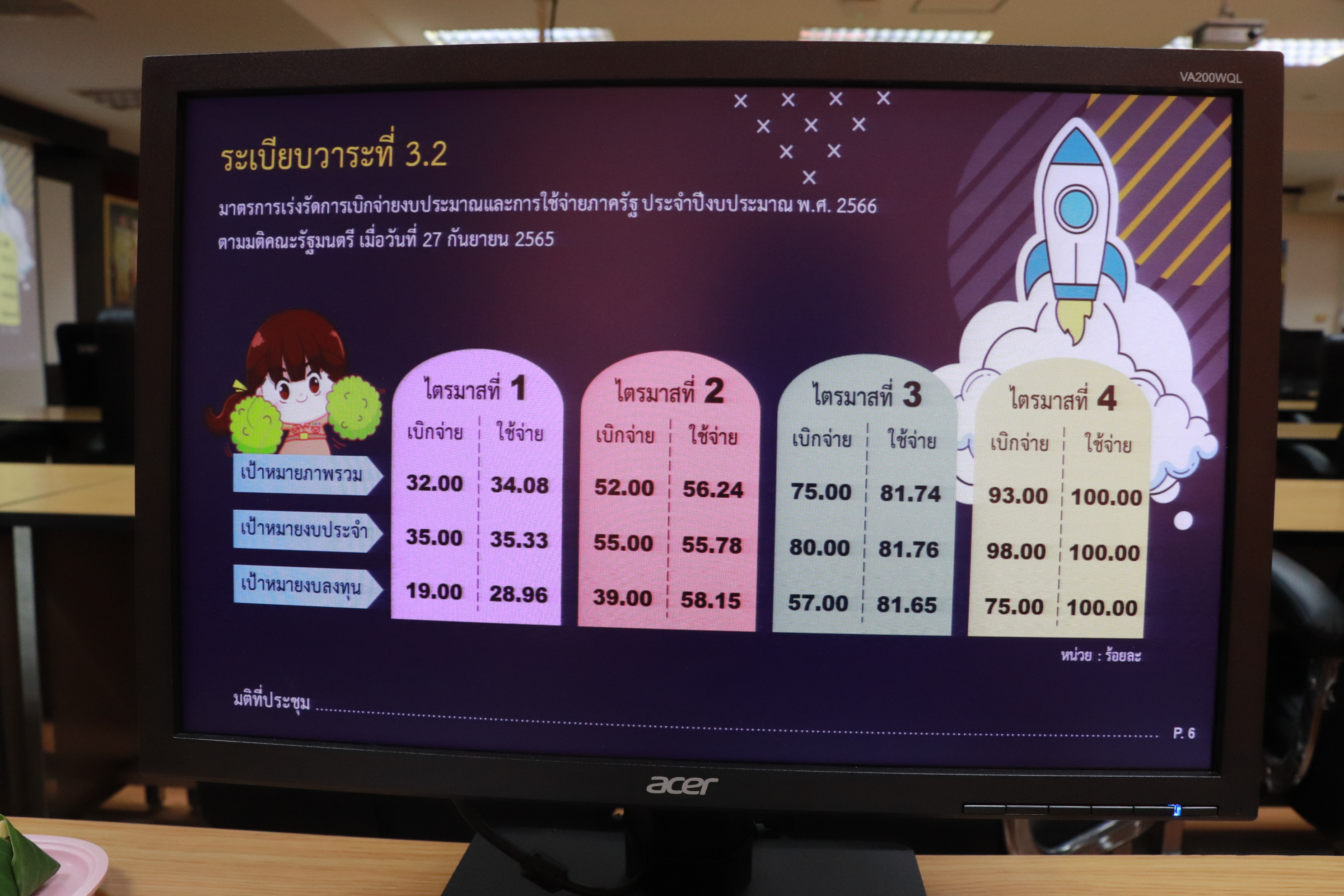 โดยที่ประชุมได้กำหนดมาตรการเร่งรัดการเบิกจ่ายงบประมาณ และการใช้จ่ายภาครัฐ ประจำปีงบประมาณ 2566 ประกอบด้วย มาตรการเงินกันไว้เบิกเหลื่อมปีของปีงบประมาณ พ.ศ.2565 ให้เร่งรัดการเบิกจ่ายเงินกันไว้เบิกเหลื่อมปีของปีงบประมาณ พ.ศ.2565 ให้สามารถเบิกจ่ายอย่างมีนัยสำคัญได้ภายในไตรมาสที่ 1 ของปีงบประมาณ พ.ศ.25666 โดยเฉพาะในส่วนของรายจ่ายที่ก่อหนี้ผูกพันแล้ว และมาตรการการกำหนดเป้าหมายการเบิกจ่ายเงินประมาณและการใช้จ่ายภาครัฐระดับจังหวัด โดยกำหนดเป้าหมายการเบิกจ่ายงบประมาณรายจ่ายภาพรวมไม่น้อยกว่า ร้อยละ 93 ,การเบิกจ่ายงบประมาณรายข่ายประจำไม่น้อยกว่า ร้อยละ 98 ,การเบิกจ่ายงบประมาณรายข่ายลงทุน ไม่น้อยกว่า ร้อยละ 93 และการใช้จ่ายงบประมาณรายจ่ายภาพรวม รายจ่ายประจำ และรายจ่ายลงทุน ร้อยละ 100 เพื่อให้หน่วยรับงบประมาณในจังหวัดแม่ฮ่องสอน ดำเนินการเบิกจ่ายงบประมาณสอดคล้องกับเป้าหมายดังกล่าว