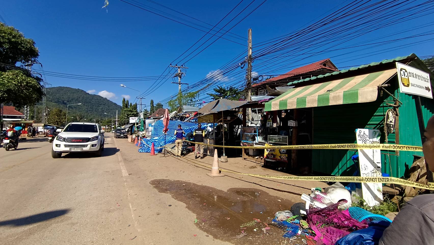 นายอำเภอปางมะผ้า อ.ปางมะผ้า จ.แม่ฮ่องสอน สั่งหน่วยงานความมั่นคง นำอส.เร่งเคลียร์พื้นที่รอบๆ จุดเกิดเหตุระเบิด ขณะที่เจ้าหน้าที่กองพิสูจน์หลักฐานลงพื้นที่หาหลักฐานการเกิดเหตุแล้ว