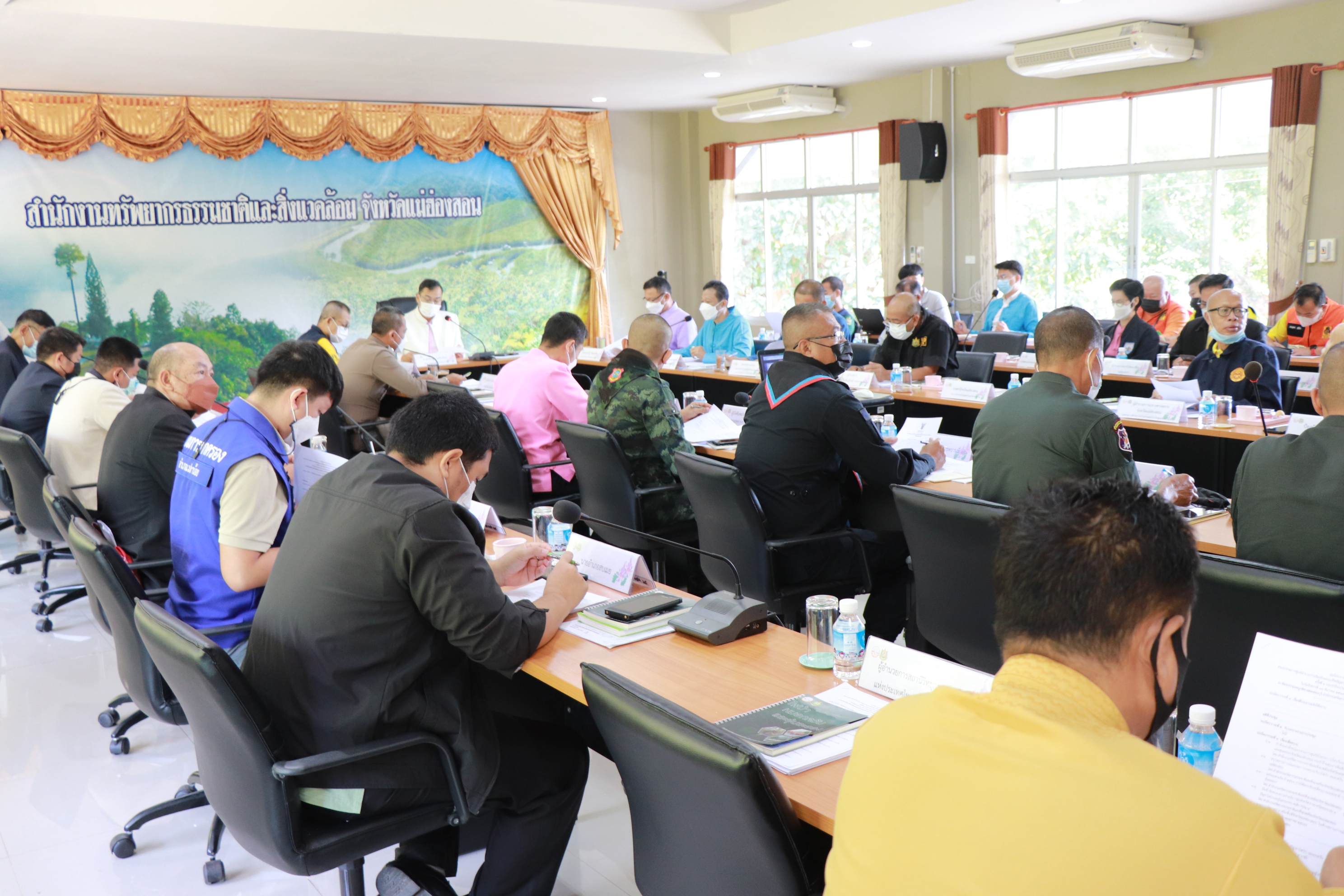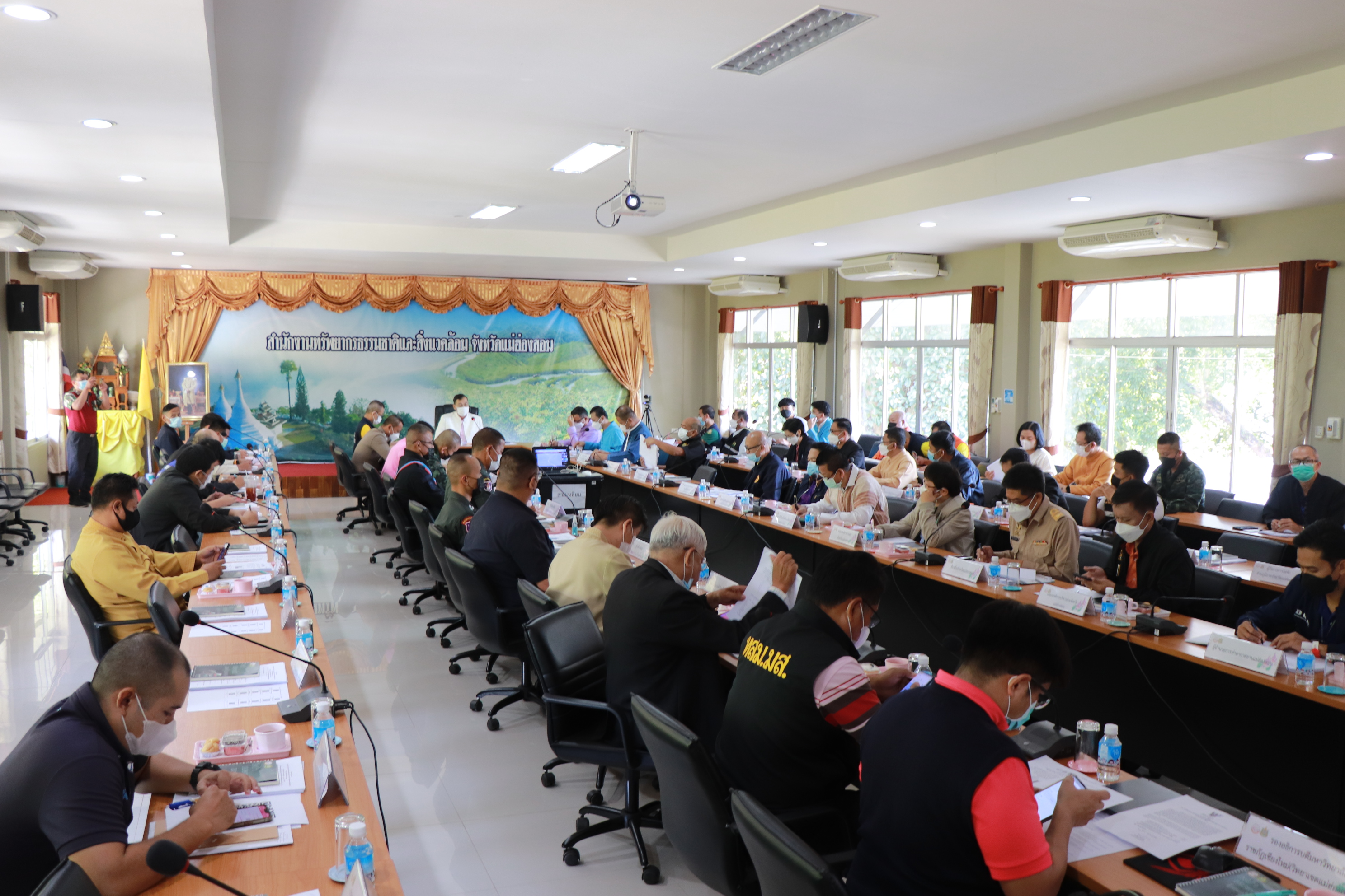 วันที่ 13 ธันวาคม 2564 เวลา 09.30 น.ที่ห้องประชุมพญาพิศาลฮ่องสอนบุรี สำนักงานทรัพยากรธรรมชาติและสิ่งแวดล้อมจังหวัดแม่ฮ่องสอน นายเชษฐา โมสิกรัตน์ ผู้ว่าราชการจังหวัดแม่ฮ่องสอน เป็นประธานการประชุมคณะกรรมการศูนย์อำนวยการป้องกันและแก้ไขปัญหาไฟป่า หมอกควัน และฝุ่นละอองจังหวัดแม่ฮ่องสอน ครั้งที่ 1 ประจำปี 2566 โดยที่ประชุมได้รับทราบสรุปผลการดำเนินสถานการณ์และการถอดบทเรียนไฟป่า หมอกควัน และฝุ่นละอองในพื้นที่จังหวัดแม่ฮ่องสอน แผนเฉพาะกิจการแก้ไขปัญหาหมอกควันไฟป่าปี 2566 ภายใต้แผนขับเคลื่อนวาระแห่งชาติการแก้ไขปัญหามลพิษด้านฝุ่นละออง และรับทราบผลบันทึกข้อตกลงความร่วมมือกลุ่มจังหวัดภาคเหนือตอนบน 1 ในการบูรณาการแก้ไขปัญหาฝุ่นละอองขนาดเล็ก PM 2.5 และการคาดการสภาพอากาศในพื้นที่จังหวัดแม่ฮ่องสอนสถานการณ์ 2566