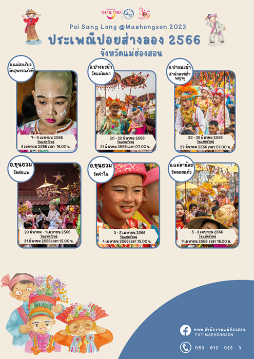 เมื่อวันที่ 23 มีนาคม 2566 ว่าที่ ร.ต.ภาณุวัฒน์ ขัดนาค ผอ.ททท.สำนักงานแม่ฮ่องสอน เปิดเผยว่า ในช่วงนี้กิจกรรมการท่องเที่ยวในจังหวัดมีกิจกรรมเด่นก็คือ กิจกรรมประเพณีปอยส่างลอง ซึ่งเป็นมนต์เสน่ห์หนึ่งในงานประจำปีเลื่องชื่อของชาวไทใหญ่แห่งเมืองสามหมอก ซึ่งนอกจากจะมากไปด้วยสีสันงดงามเป็นเอก ลักษณ์แล้ว ยังเป็นงานบุญที่เปี่ยมไปด้วยพลังแห่งศรัทธาอันทรงคุณค่า และได้ขยายไปสู่พื้นที่ต่าง ๆ อาทิ จ.เชียงใหม่ เชียงราย โดย จ.แม่ฮ่องสอน นับเป็นต้นแบบของการจัดประเพณีปอยส่างลองของประเทศไทย