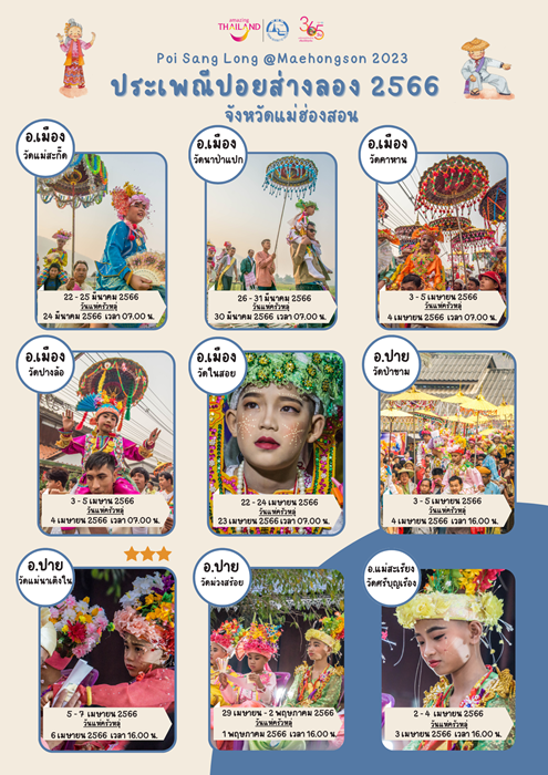 โดยมีกำหนดจัดงานประเพณีปอยส่างลองในพื้นที่ต่างๆ ของ จ.แม่ฮ่องสอนดังนี้