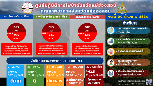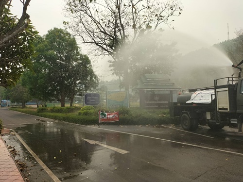 ที่อำเภอปาย นายเอนก ปันทะยม ผู้อำนวยการศูนย์ปฏิบัติการป้องกันและแก้ไขปัญหาไฟป่าหมอกควันและฝุ่นละอองขนาดเล็ก อำเภอปาย จังหวัดแม่ฮ่องสอน ได้รับรายงานผลการปฏิบัติงาน เพื่อเป็นการป้องกันและแก้ไขปัญหาหาไฟป่าหมอกควันและฝุ่นละอองขนาดเล็ก ในพื้นที่อำเภอปาย ซึ่งมีค่า pm 2.5 จากหมอกควันไฟป่า ซึ่งเกินค่ามาตรฐานอยู่ในขั้นที่มีผลกระทบต่อสุขภาพ โดยประสานองค์กรปกครองส่วนท้องถิ่นในพื้นที่อำเภอปาย และ เจ้าหน้าที่ศูนย์ ปภ.เขต 10 ที่มาประจำการอยู่ในพื้นที่อำเภอปาย กรมอุทยานสัตว์ป่าและพันธุ์พืช นำรถบรรทุกน้ำฉีดพ่นละอองน้ำเพื่อลดผลกระทบด้านสุขภาพอนามัยของประชาชนในพื้นที่ และนักท่องเที่ยวที่เดินทางมาท่องเที่ยวในพื้นที่อำเภอปาย ณ หน้าที่ว่าการอำเภอปาย