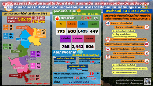 ที่จังหวัดแม่ฮ่องสอน นายเชษฐา โมสิกรัตน์ ผู้ว่าราชการจังหวัดแม่ฮ่องสอน ได้สั่งการให้ทั้ง7 อำเภอ เร่งระดมกำลังเจ้าหน้าที่ ออกให้ความช่วยเหลือประชาชนที่ได้รับผลกระทบจากสถานการณ์หมอกควันไฟป่าที่ส่งผลต่อสุขภาพของประชาชนอย่างต่อเนื่องทั้งการฉีดพ่นละอองน้ำ เพื่อสร้างความชุ่มชื่นในอากาศ การออกแจกจ่ายหน้ากากอนมัยให้กับประชาชน โดยเฉพาะกลุ่มผู้ป่วยและกลุ่มเปราะบางที่ได้รับผลระทบจากสภาพอากาศ