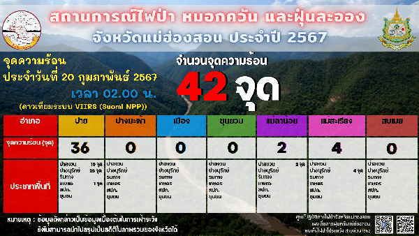 สำหรับสถานการณ์ไฟป่า หมอกควันและฝุ่นละออง ในพื้นที่ จ.แม่ฮ่องสอน ประจำวันที่ 20 กุมภาพันธ์ 2567 พบจุดความร้อน ช่วงเช้า จำนวน 42 จุด ในพื้นที่ อ.ปาย 36 จุด , อ.แม่ลาน้อย 2 จุด และ อ.แม่สะเรียง 4 จุด คุณภาพอากาศเกินมาตรฐานที่ ต.เวียงใต้ อ.ปาย วัดได้ 57.8 ไมโครกรัมต่อลูกบาศก์เมตร (ค่ามาตรฐานเกิน 37.5 ไมโครกรัมต่อลูกบาศก์เมตร คุณภาพอากาศโดยรวมอยู่ในระดับเริ่มมีผลกระทบต่อสุขภาพ)