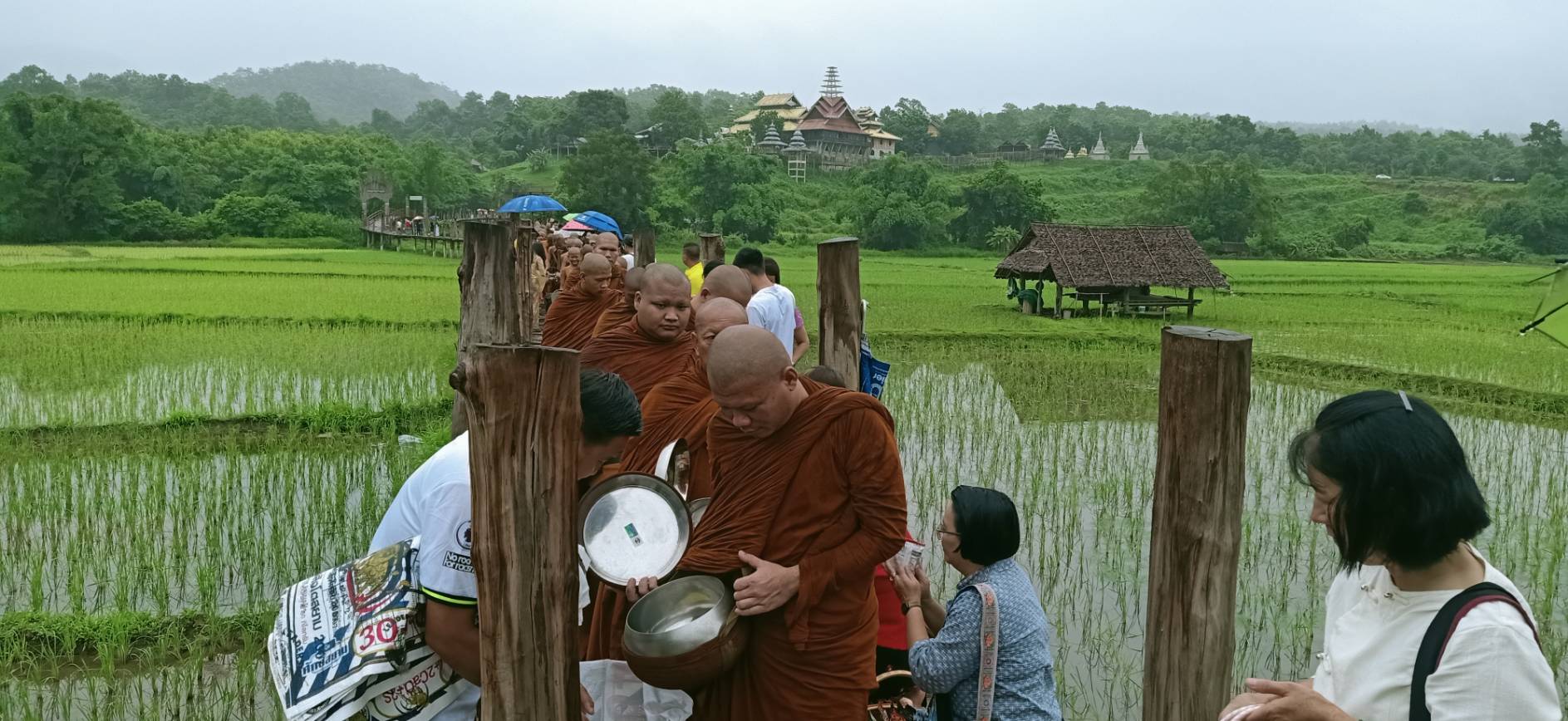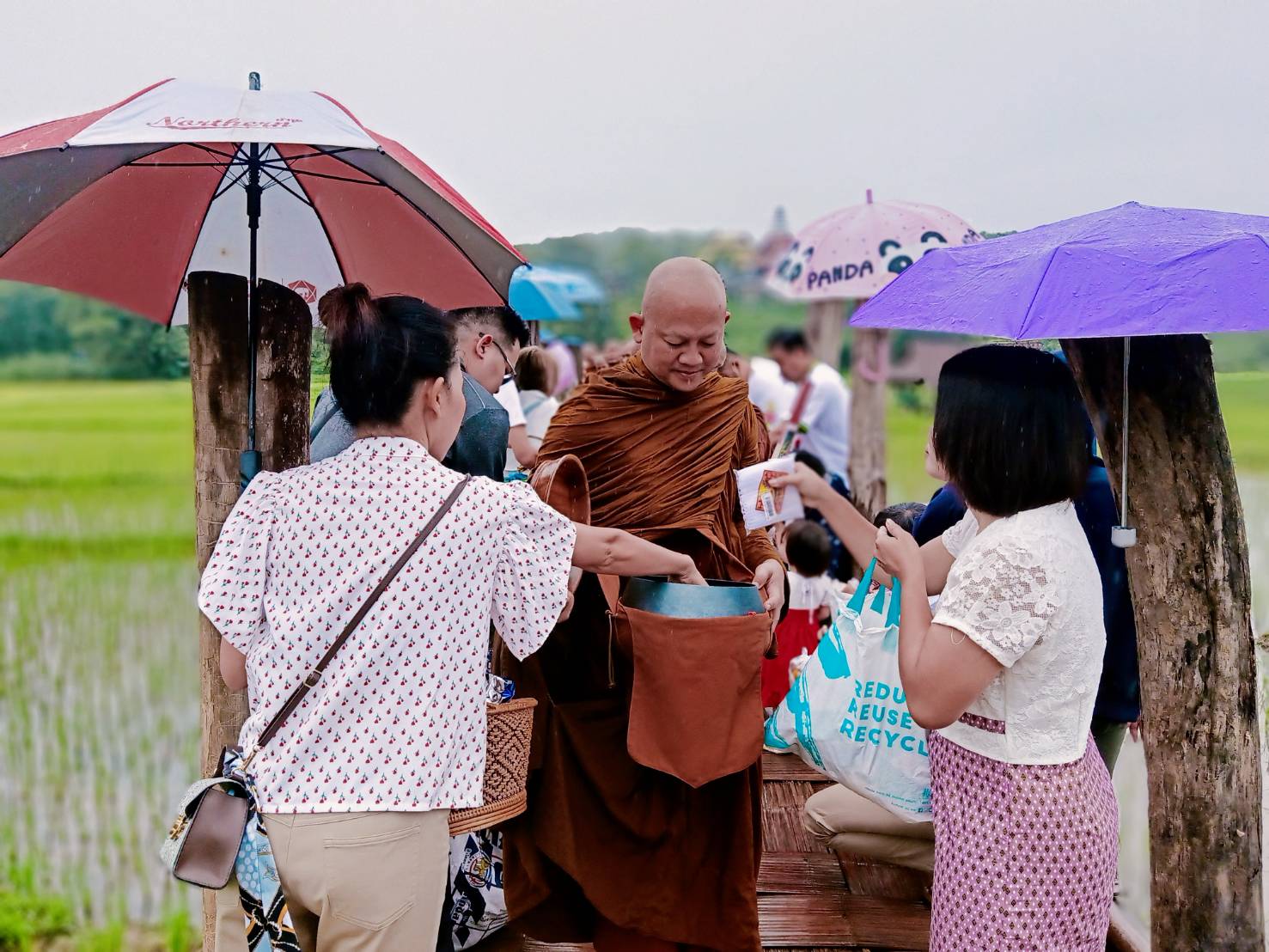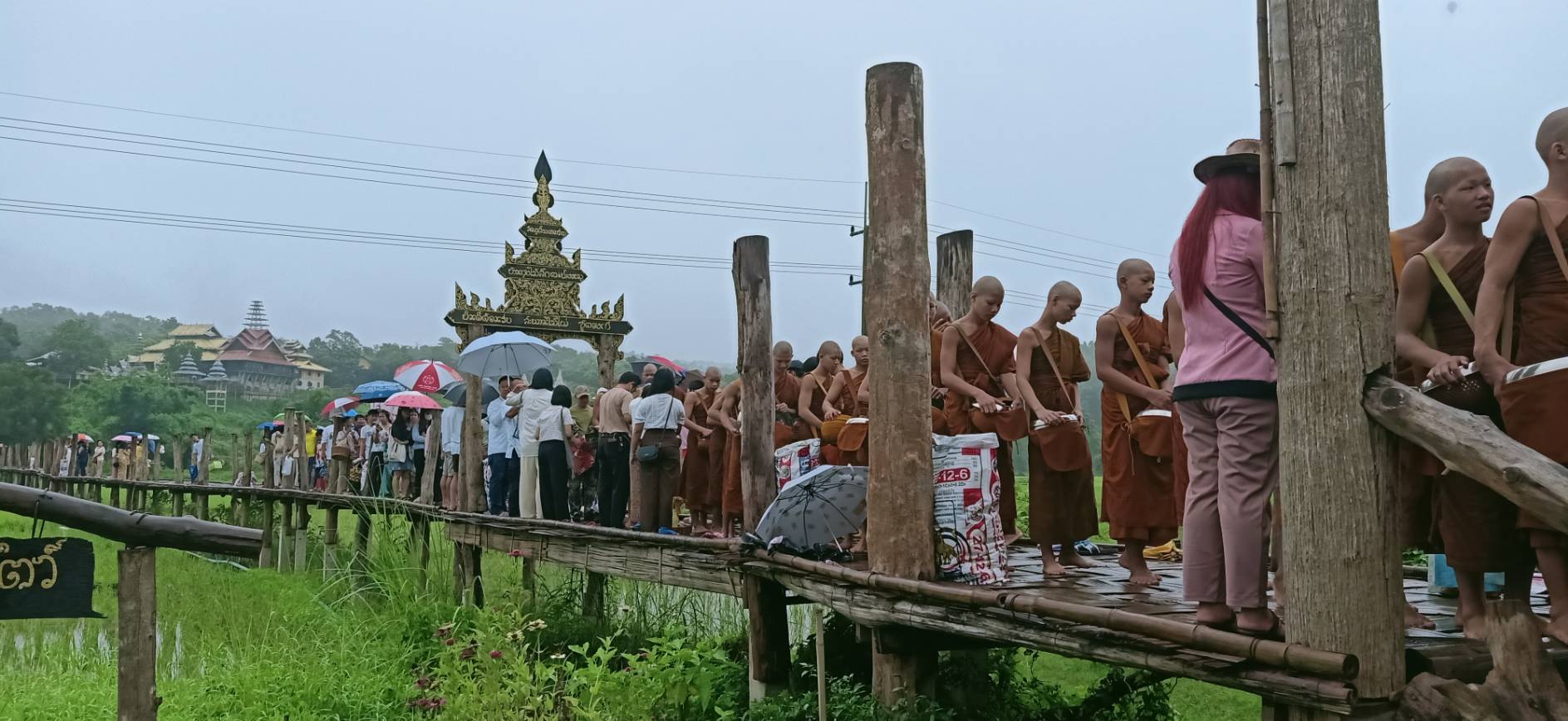 ชาวแม่ฮ่องสอนและนักท่องเที่ยว พากันร่วมทำบุญตักบาตร ที่สะพานซูตองเป้ สะพานแหล่งท่องเที่ยวชื่อดัง ในวันเข้าพรรษาท่ามกลางสายฝนที่โปรายปรายมาชุ่มฉ่ำให้แก่ทุกคน