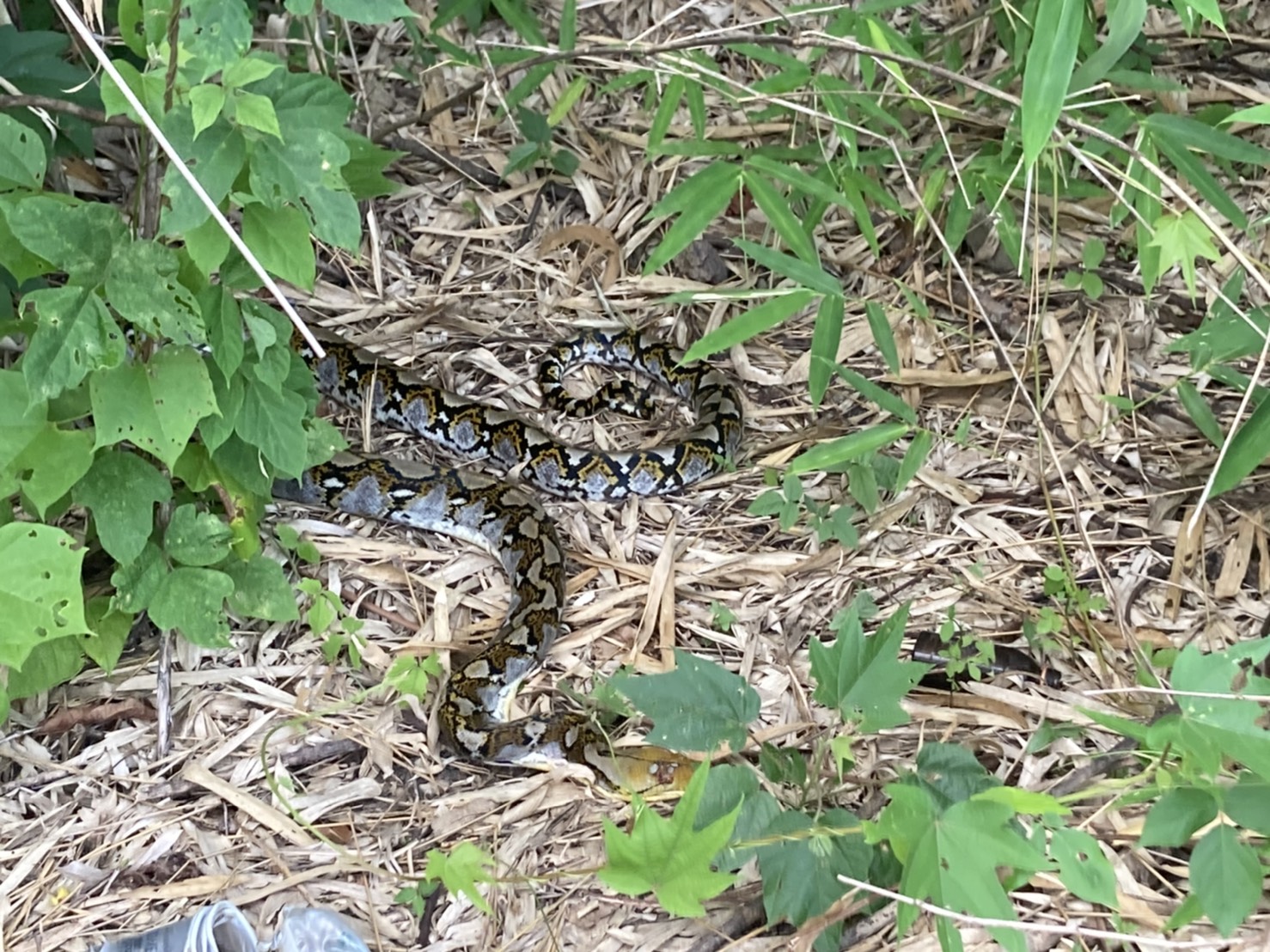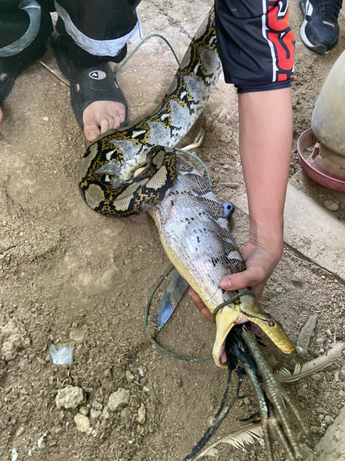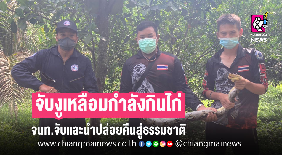 จึงได้แจ้งให้ จนท.ของมูลนิธิพร้อมกับเหยี่ยวฟ้า27 รุดไปให้ความช่วยเหลือ พบว่าเป็นสัตว์เลื้อยคลานประเภทงู (งูเหลือม)กำลังกินไก่ในเล้าไก่ ที่บ้านสวน ได้พร้อมของกลางเป็นไก่ตายแล้วกำลังถูกกลืนเข้าไปในปาก จึงได้ช่วยกันจับและนำปล่อยคืนสู่ธรรมชาติต่อไป