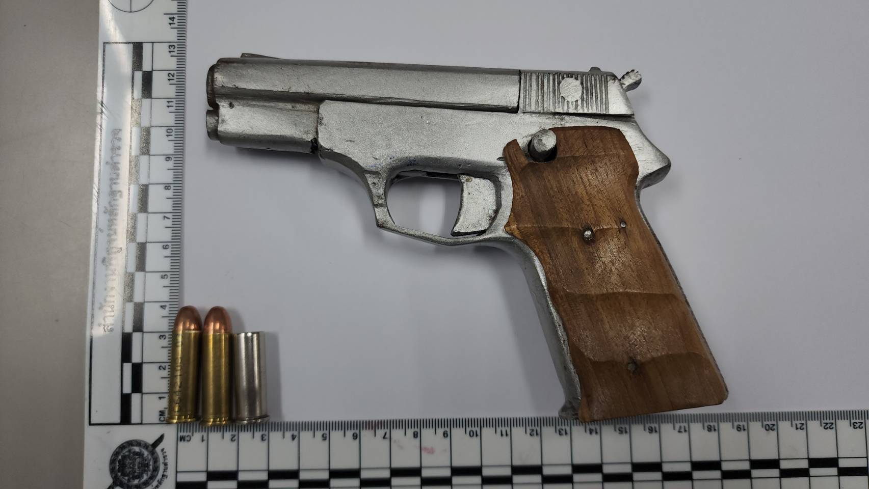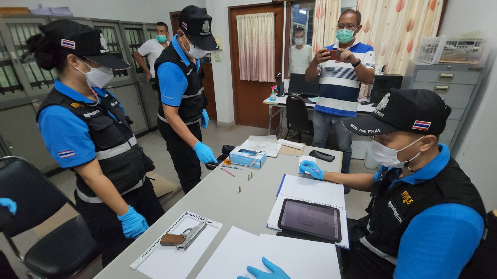 ส่วนมือปืนชื่อ นายสมศักดิ์ (สงวนนามสกุล) อายุ 40 ปี บ้านนาล้อม หมู่ที่ 7 ตำบลน้ำแก่น อำเภอภูเพียง จังหวัดน่าน ยืนรอ มอบตัวอยู่ ณ จุดเกิดเหตุ พร้อมด้วยอาวุธปืนพกสั้นไทยประดิษฐ์ แบบหักลำบรรจุทีละนัด ขนาด .38 พร้อมลูกกระสุนปืนขนาด .38 ที่ยังไม่ได้ยิงจำนวน 1 นัด ลูกกระสุนปืนอยู่ในรังเพลิงอีก 1 นัด ปลอกกระสุนปืน 1 นัดจึงได้ตรวจยึดเก็บไว้เป็นหลักฐาน