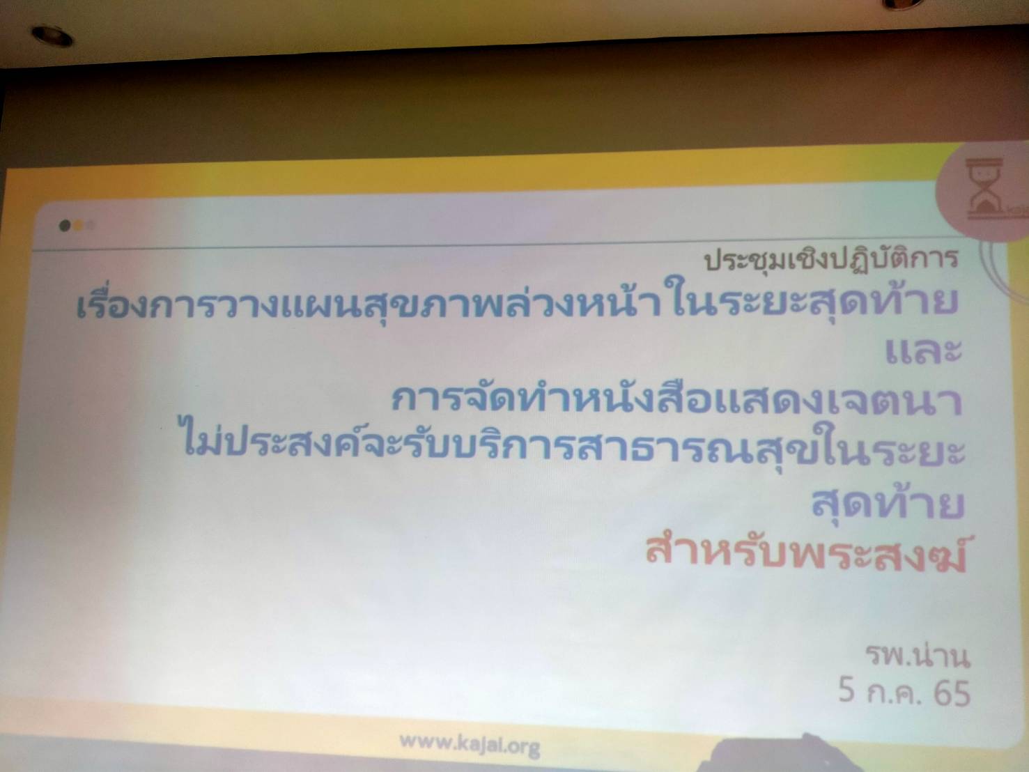 เมื่อวันที่ 5 กรกฎาคม 2565 ที่ ห้องประชุมชั้น 2 ตึกอุบัติเหตุ – ฉุกเฉิน โรงพยาบาลน่าน อำเภอเมืองน่าน จังหวัดน่าน แพทย์หญิงอัจฉรา ละอองนวลพานิช ผู้อำนวยการโรงพยาบาลน่าน เป็นประธานในการเปิดการประชุมเชิงปฏิบัติการเพื่อสร้างความเข้าใจ และการตระหนักถึงความสำคัญของการวางแผนสุขภาพล่วงหน้าในระยะสุดท้ายและการจัดทำหนังสือแสดงเจตนาไม่ประสงค์จะรับบริการสาธารณสุขในระยะสุดท้าย ตามมาตรา 12 พระราชบัญญัติ สุขภาพแห่งชาติ พ.ศ. 2550