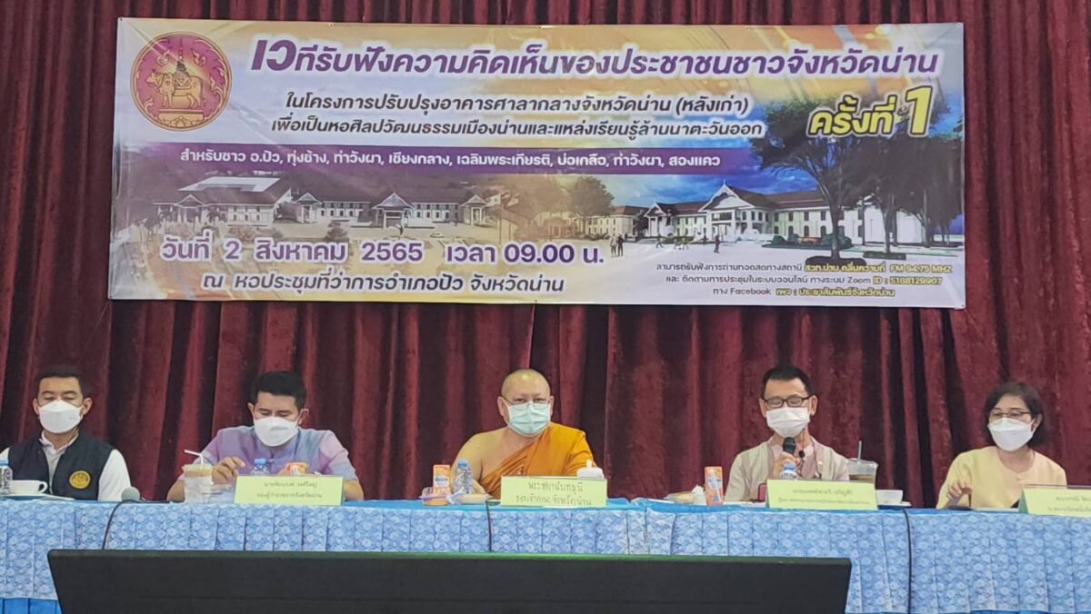 เมื่อวันที่ 2 กันยายน 2565 ณ หอประชุมที่ว่าการอำเภอปัว จังหวัดน่าน นายชัยนรงค์ วงศ์ใหญ่ รองผู้ว่าราชการจังหวัดน่าน เป็นประธานเปิดเวทีรับฟังความคิดเห็นของประชาชนชาวจังหวัดน่าน โครงการปรับปรุงศาลากลางจังหวัดน่าน (หลังเก่า) ครั้งที่ 1 พร้อมด้วยพระชยานันทมุนี รองเจ้าคณะจังหวัดน่าน หัวหน้าส่วนราชการ องค์กรปกครองส่วนท้องถิ่น สื่อมวลชน ผู้ทรงคุณวุฒิ นักศึกษา และประชาชนชาวจังหวัดน่าน เข้าร่วมเวทีในครั้งนี้