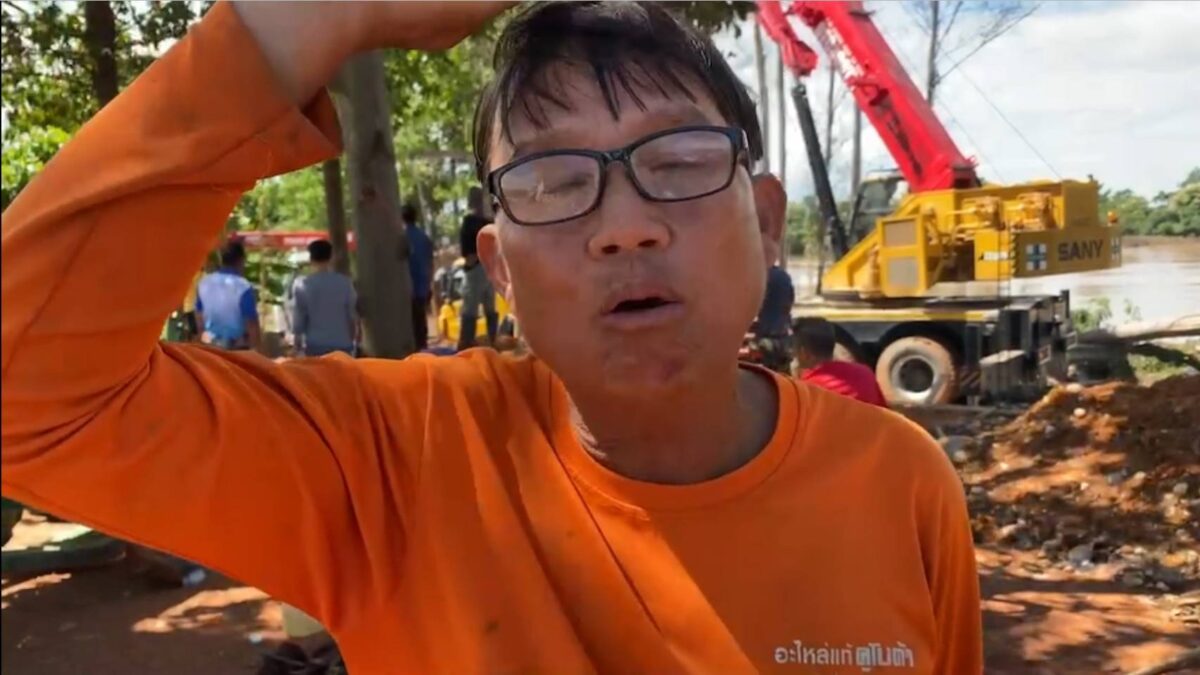 แต่ในขณะกำลังเก็บกู้น้ำได้เพิ่มสูงขึ้นมาอย่างรวดเร็วและมีความรุนแรง แล้วอยู่ดีๆ กอไผ่ที่ไหลตามน้ำมาทั้งกอได้มาชนกับโป๊ะจนทำให้สบิงที่ยึดไว้ขาดแล้วไหล่ไปตามน้ำ ตนกำลังสับสนพอรู้ตัวอีกทีก็ไหลมาจนจะถึงสะพาน โดยรู้อยู่แล้วว่าข้างหน้ามีสายไฟและสายสื่อสาร ขณะนั้น เรือกู้ภัยก็ได้จะเข้ามาช่วยตนแต่ เกิดอุบัติเหตุมีใบหญ่าและต้นข้าวโพดไปติดใบพัดเรือ