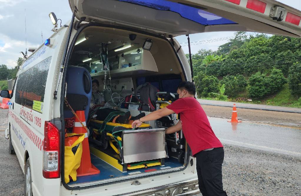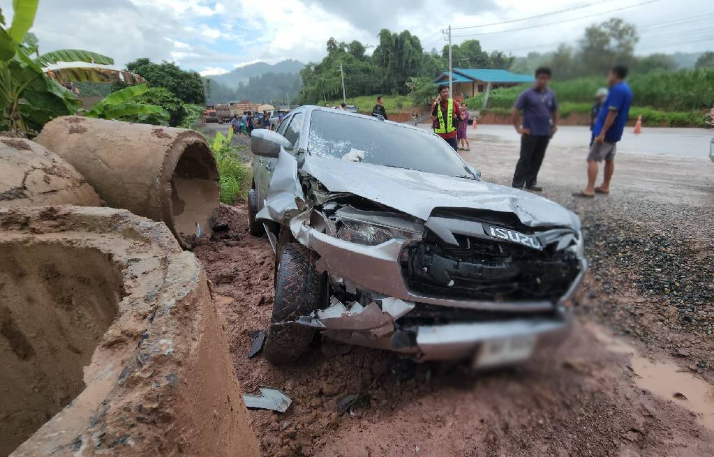จึงรุดตรวจสอบในที่เกิดเหตุพบว่าเป็น ถนนอยู่ในระหว่างการก่อสร้างพบ ทีมกู้ชีพ อบต.สะเนียน ทีมรถกู้ชีพศูนย์นเรนทรน่าน กำลังให้ความช่วยเหลือปฐมพยาบาล ผู้ที่ได้รับบาดเจ็บเบื้องต้น ณ จุดเกิดเหตุก่อนนำส่งโรงพยาบาลน่าน และพบรถยนต์กระบะ อีซูซุ ทะเบียชลบุรี สภาพด้านหน้าพังยับกระจกแตก ล้อขวาแตกหลุดกระจกหน้าแตก หน้ารถกระแทกท่อระบายน้ำ ตัวรถอยู่ในร่องน้ำ ไม่สามารถขับเคลื่อนได้ ซึ่งมีนายธีรพงษ์ (สงวนนามสกุล)อายุ 38 ปี ชาวบ้านดอนเฟือง หมู่ที่ 2 ตำบลเรือง อำเภอเมืองน่าน จังหวัดน่าน เป็นคนขับ ส่วนผู้ที่ได้บาดเจ็บสาหัส ชื่อนายนิตย์ (สงวนนามสกุล) อายุ 59 ปี อยู่บ้านหมู่ที่ 4 ตำบลตาลชุม อำเภอเวียงสา จังหวัดน่าน ผู้เสียชีวิตในเวลาต่อมา และนางเอมอร (สงวนนามสกุล) อายุ 35 ปี หมู่ที่ 5 ตำบลน้ำปาย อำเภอแม่จริม จังหวัดน่าน บาดเจ็บสาหัส