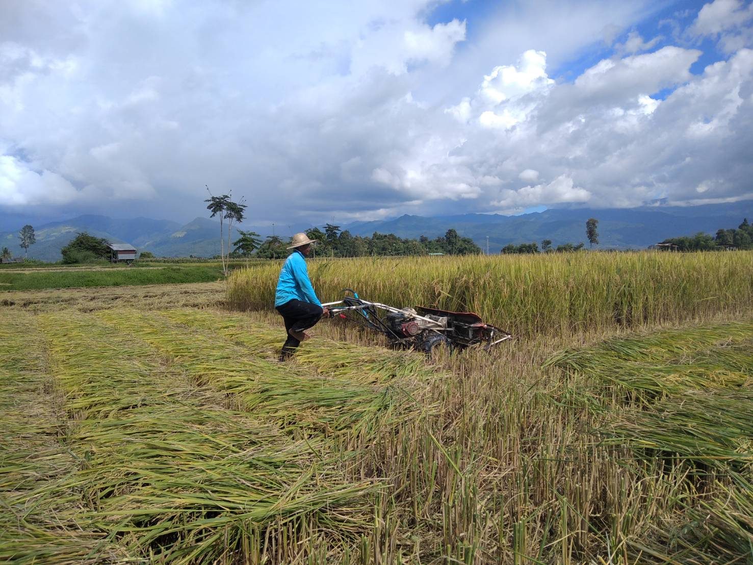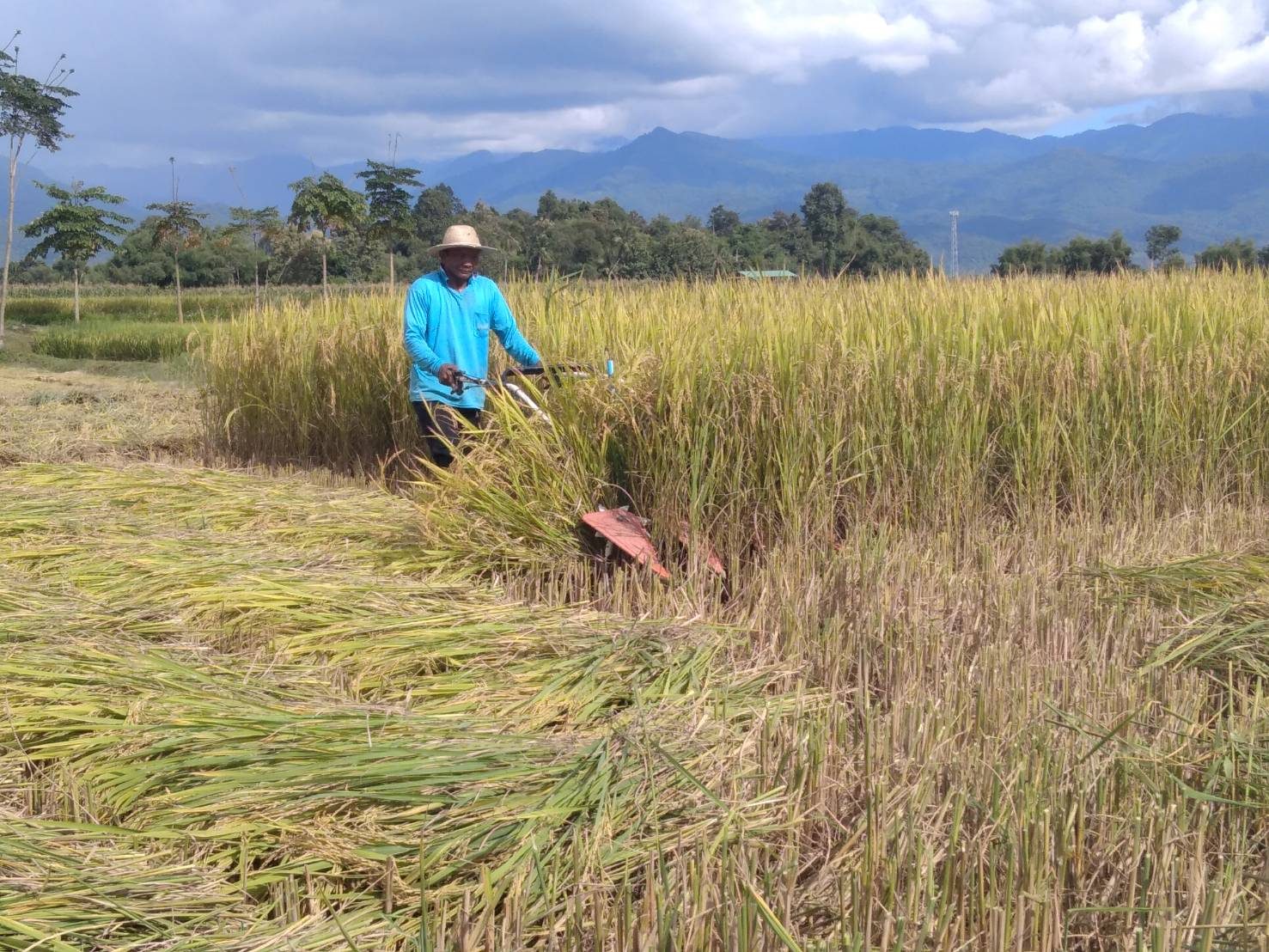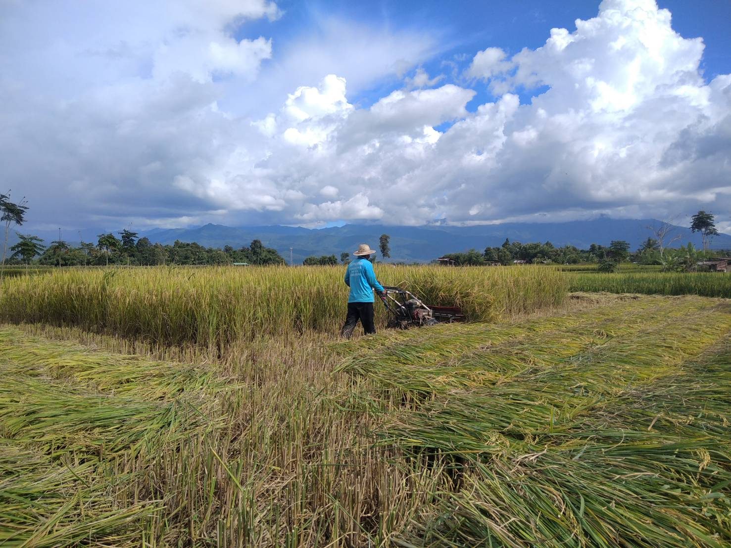ที่แปลงนาของชาวบ้านท่าควาย หมู่ที่ 3 ตำบลไชยวัฒนา อำเภอปัว จังหวัดน่าน นายไชยยศ สุไชยยะ พร้อมด้วย นางจันทร์แรม สุไชยยะ สองสามีภรรยา นำรถเกี่ยวข้าวแบบเดินตาม ออกรับจ้างชาวบ้านเกี่ยวข้าว ในพื้นที่ ตำบลไชยวัฒนา โดยแต่ละวันสองสามีภรรยา จะออกรับจ้างเกี่ยวข้าว เพื่อเสริมรายได้ให้กับครอบครัว ในช่วงฤดูกาลเกี่ยวข้าวของทุกปี หลังจากตนเองมีที่นาไม่กี่ไร่ ได้เร่งช่วยกันเกี่ยวข้าวของตนเอง ให้เสร็จ จากนั้นก็จะตระเวนออกไปรับจ้างเกี่ยวข้าว ให้กับผู้ที่มาติดต่อไว้ ในอัตราในราคาคงเดิม โดยคิดไร่ละ 500 บาท เนื่องจากเห็นใจชาวนาด้วยกัน ถึงแม้ราคาน้ำมันจะแพง ก็คงคิดราคาเดิม ไร่ละ 500 บาท ซึ่งมีผู้มาติดต่อล่วงหน้าแล้วกว่า 10 ราย ซึ่งชาวนาสู้ค่าแรงงานคนไม่ไหว ที่มีค่าแรงที่สูงขึ้น วันละ 300-450 บาท ต่อคนต่อวัน จึงต้องหันมาจ้างรถเกี่ยวแทนแรงงานคน เพื่อลดต้นทุน