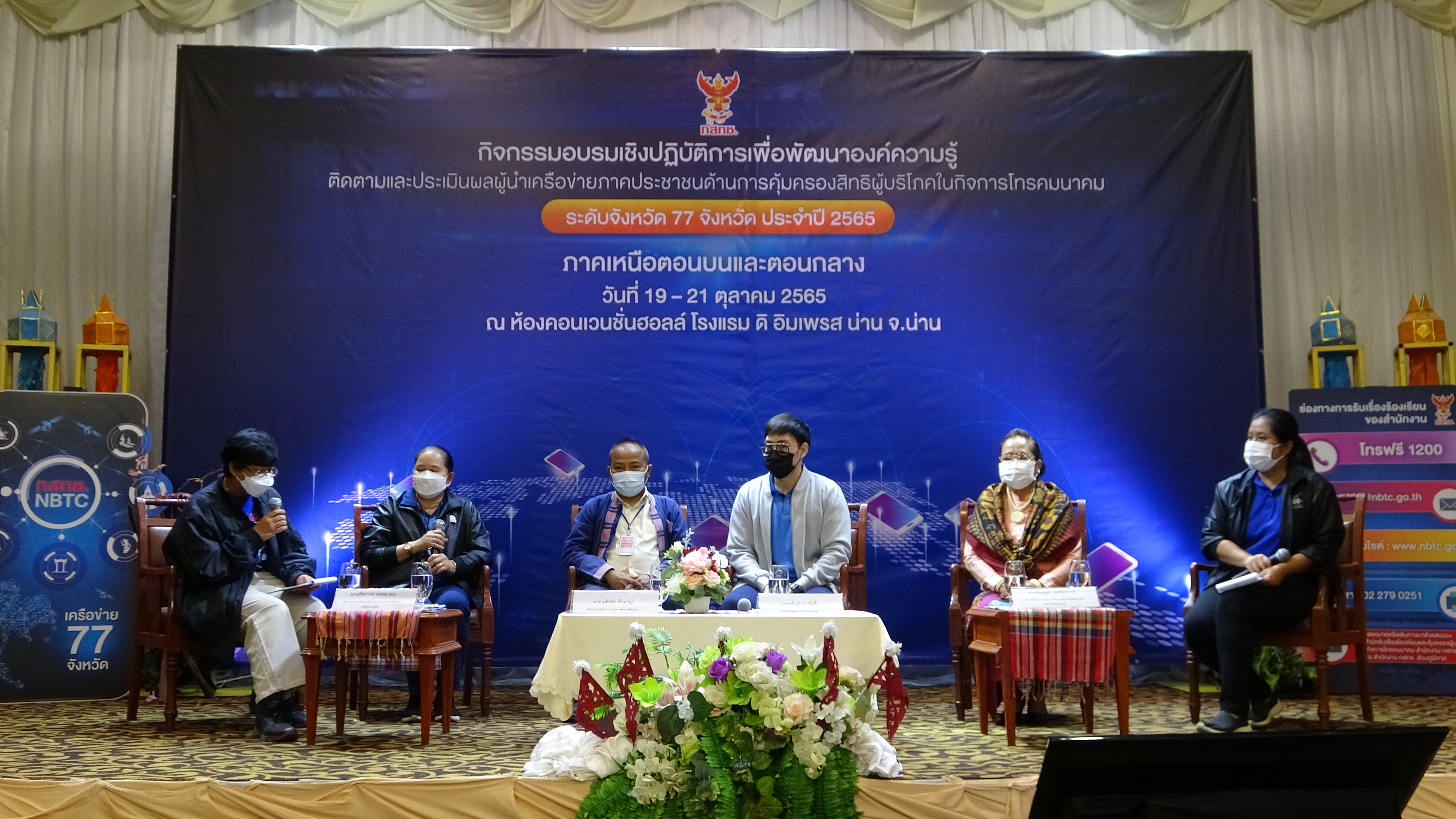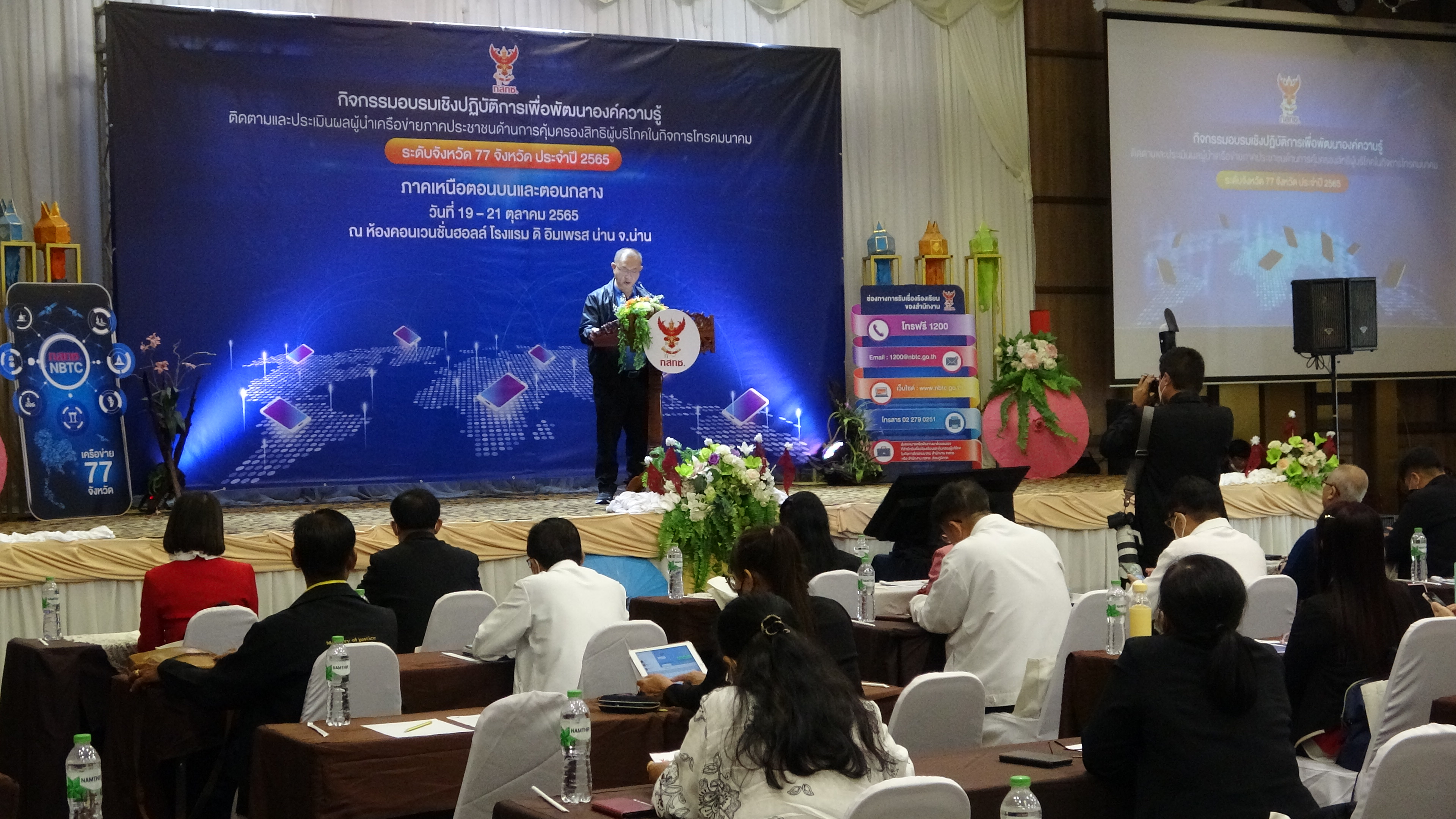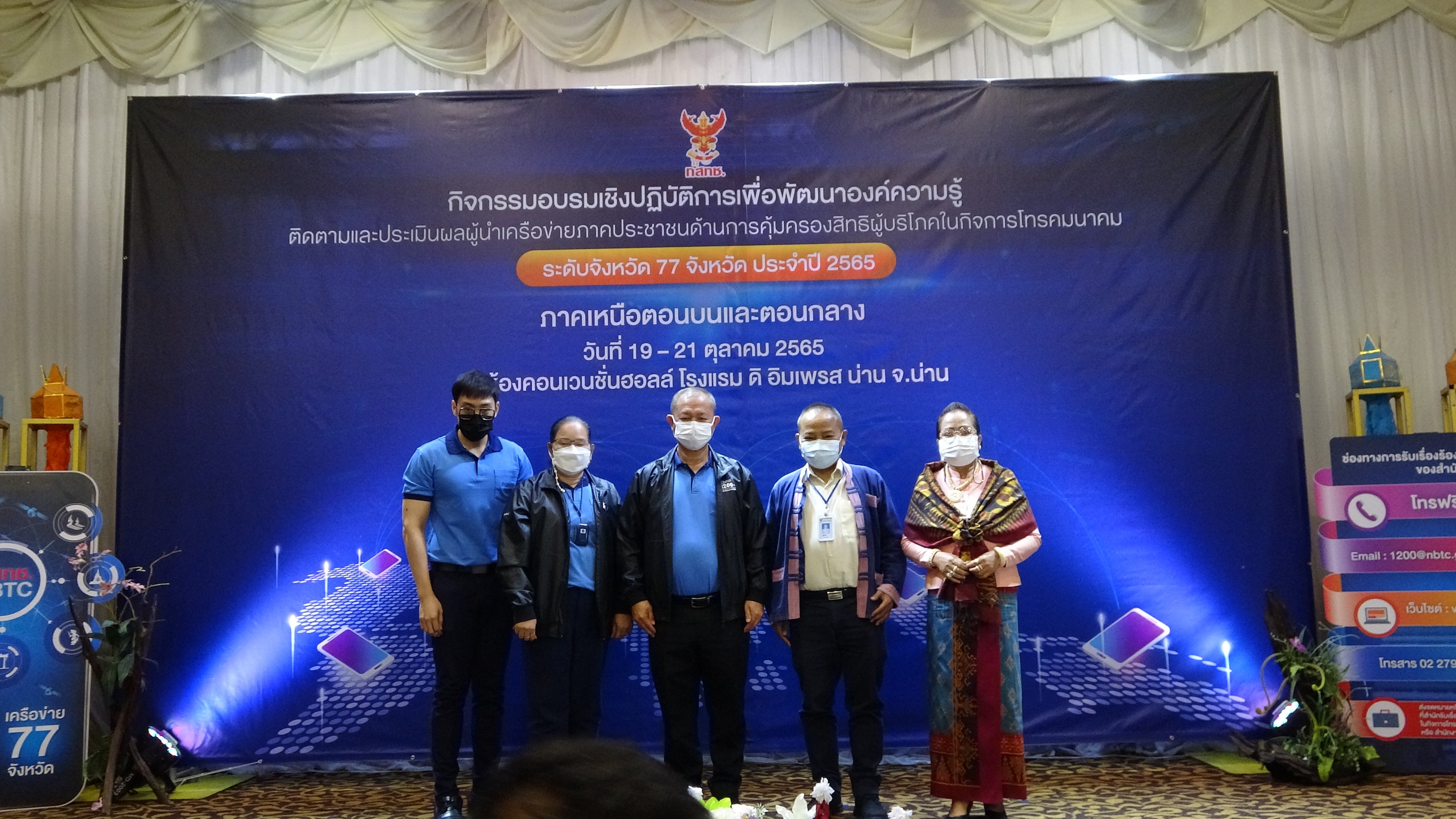 เมื่อวันที่ 20 ตุลาคม 2565 ที่ ห้องคอนเวนชั่นฮอลล์ โรงแรมดิอิมเพรสน่าน อำเภอเมืองน่าน จังหวัดน่าน นายชาญวิทย์ โวหาร นักวิชาการนโยบายและแผนอาวุโสเชี่ยวชาญ สำนักรับเรื่องร้องเรียนและคุ้มครองผู้บริโภคในกิจการโทรคมนาคม เป็นประธานเปิดกิจกรรมการอบรมเชิงปฏิบัติการ เพื่อพัฒนาองค์ความรู้ ติดตามและประเมินผลผู้นำเครือข่ายภาคประชาชนด้านการคุ้มครองสิทธิผู้บริโภคในกิจการโทรคมนาคมระดับจังหวัด 77 จังหวัด ประจำปี 2565 โดยมีผู้นำเครือข่ายด้านการคุ้มครองผู้บริโภคในกิจการโทรคมนาคม ภาคเหนือตอนบนและตอนกลาง เข้าร่วมรับฟังการเสวนาและร่วมกิจกรรมการอบรมฯ