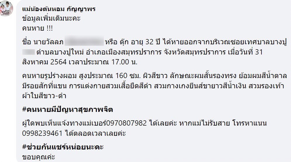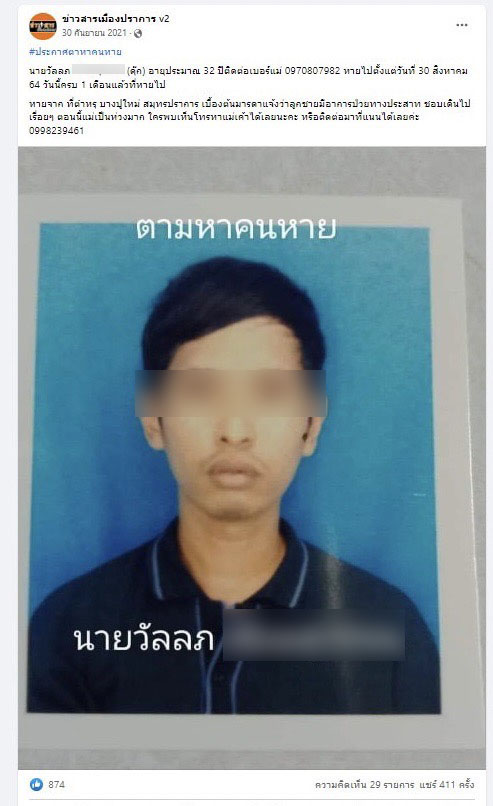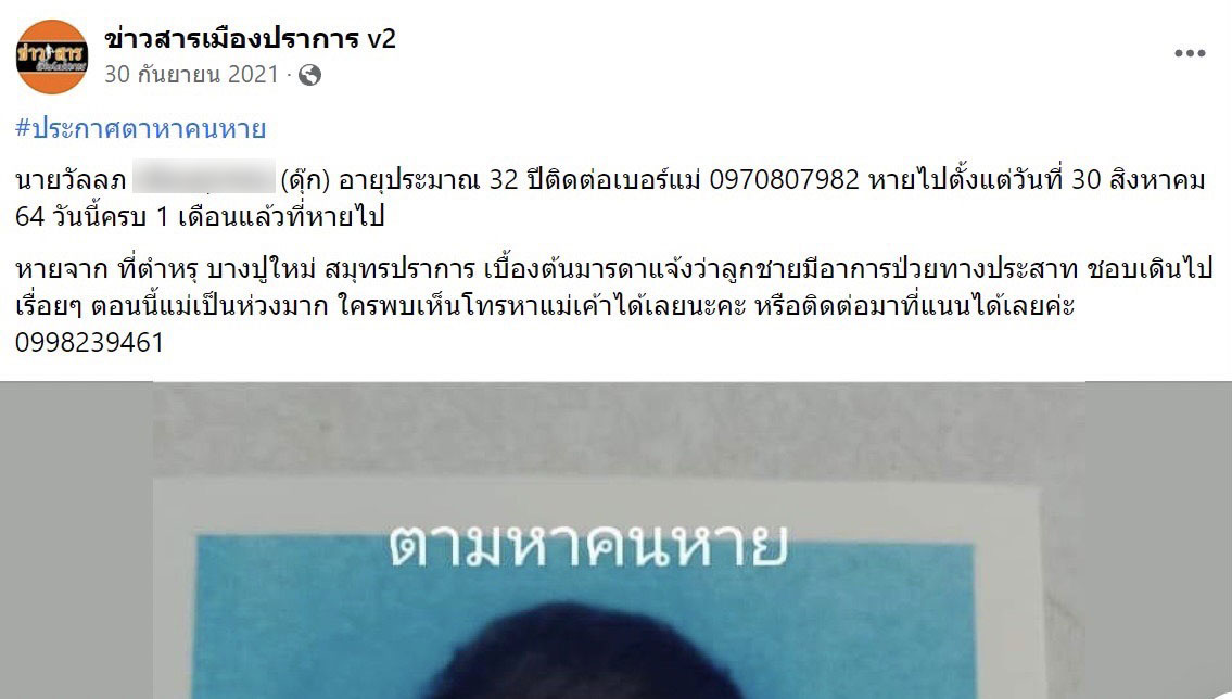 วันที่ 27 ตุลาคม 2565 จากกรณีเพจดังจังหวัดสมุทรปราการ “ข่าวสารเมืองปราการ วี2” ประกาศตามหาคนหาย เมื่อ 30 กันยายน 2564 ข้อความว่า ประกาศตามหาคนหาย นายวัลลภ เอี่ยมสุวรรณ (ดุ๊ก) อายุประมาณ 32 ปี ติดต่อเบอร์แม่ 0970807982 หายไปตั้งแต่วันที่ 30 สิงหาคม 64 วันนี้ครบ 1 เดือนแล้วที่หายไป หายจากที่ตำหรุ บางปูใหม่ สมุทรปราการ เบื้องต้นมารดาแจ้งว่าลูกชายมีอาการป่วยทางประสาท ชอบเดินไปเรื่อยๆ ตอนนี้แม่เป็นห่วงมาก ใครพบเห็นโทรหาแม่เค้าได้เลยนะคะ หรือติดต่อมาที่แนน ได้เลยค่ะ 0998239461