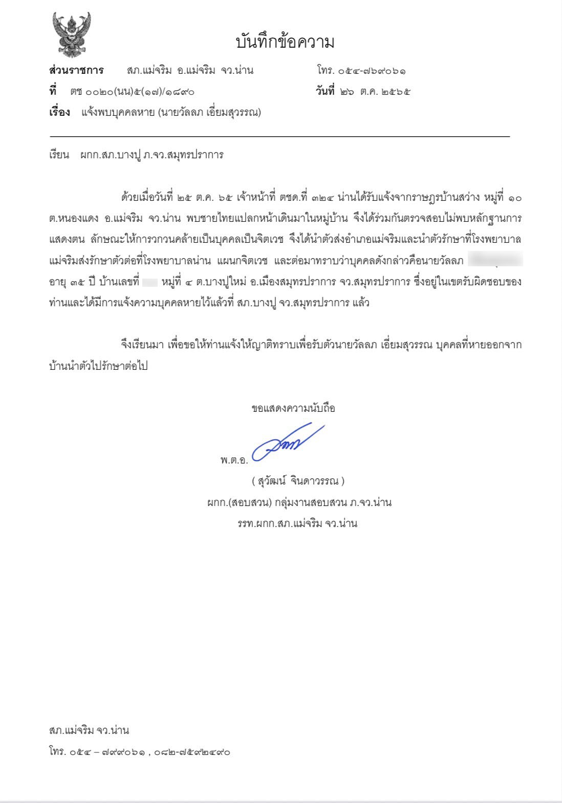เจอแล้วหลังหายจากบ้าน 1 ปี 1 เดือน 25 วัน จากบางปูสมุทรปราการ จะออกไป สปป.ลาว ทางแม่จริมน่าน
