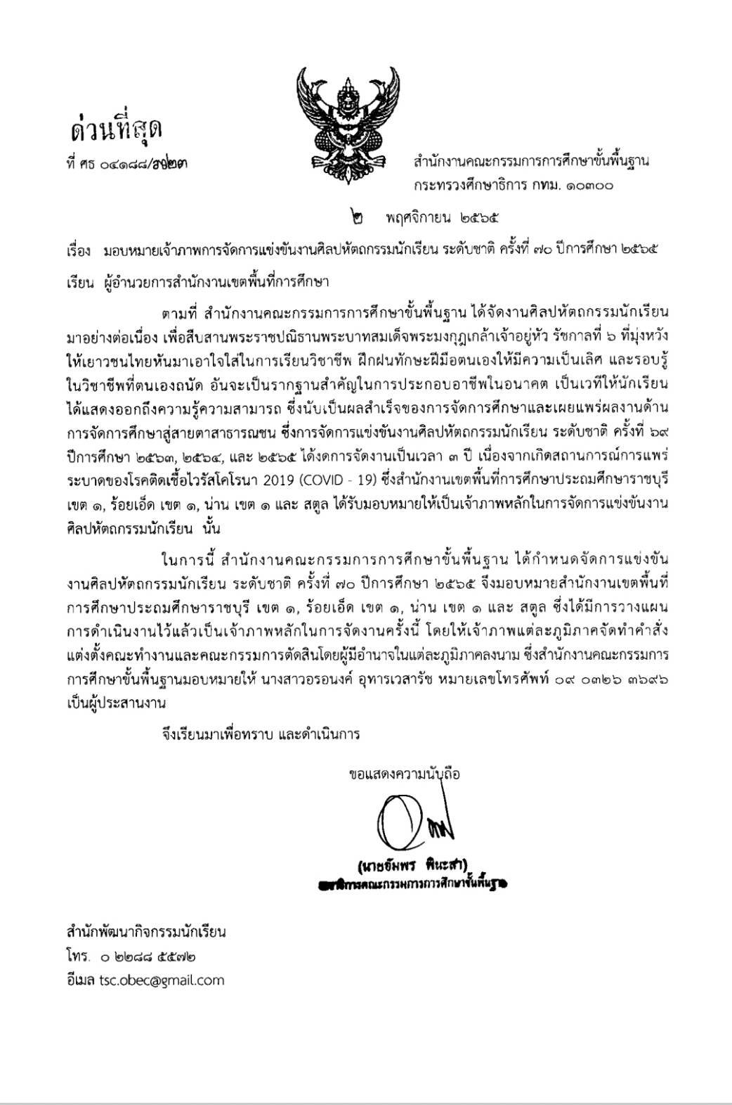ผู้สื่อข่าวรายงานว่า สพฐ.ได้มีหนังสือด่วนที่สุด ที่ ศธ 04188/6623 สำนักงานคณะกรรมการการศึกษาขั้นพื้นฐานกระทรวงศึกษาธิการ กทม. 10300 วันที่ 2 พฤศจิกายน 2565 เรื่อง มอบหมายเจ้าภาพการจัดการแข่งขันงานศิลปหัตถกรรมนักเรียน ระดับชาติ ครั้งที่ 70 ปีการศึกษา 2565